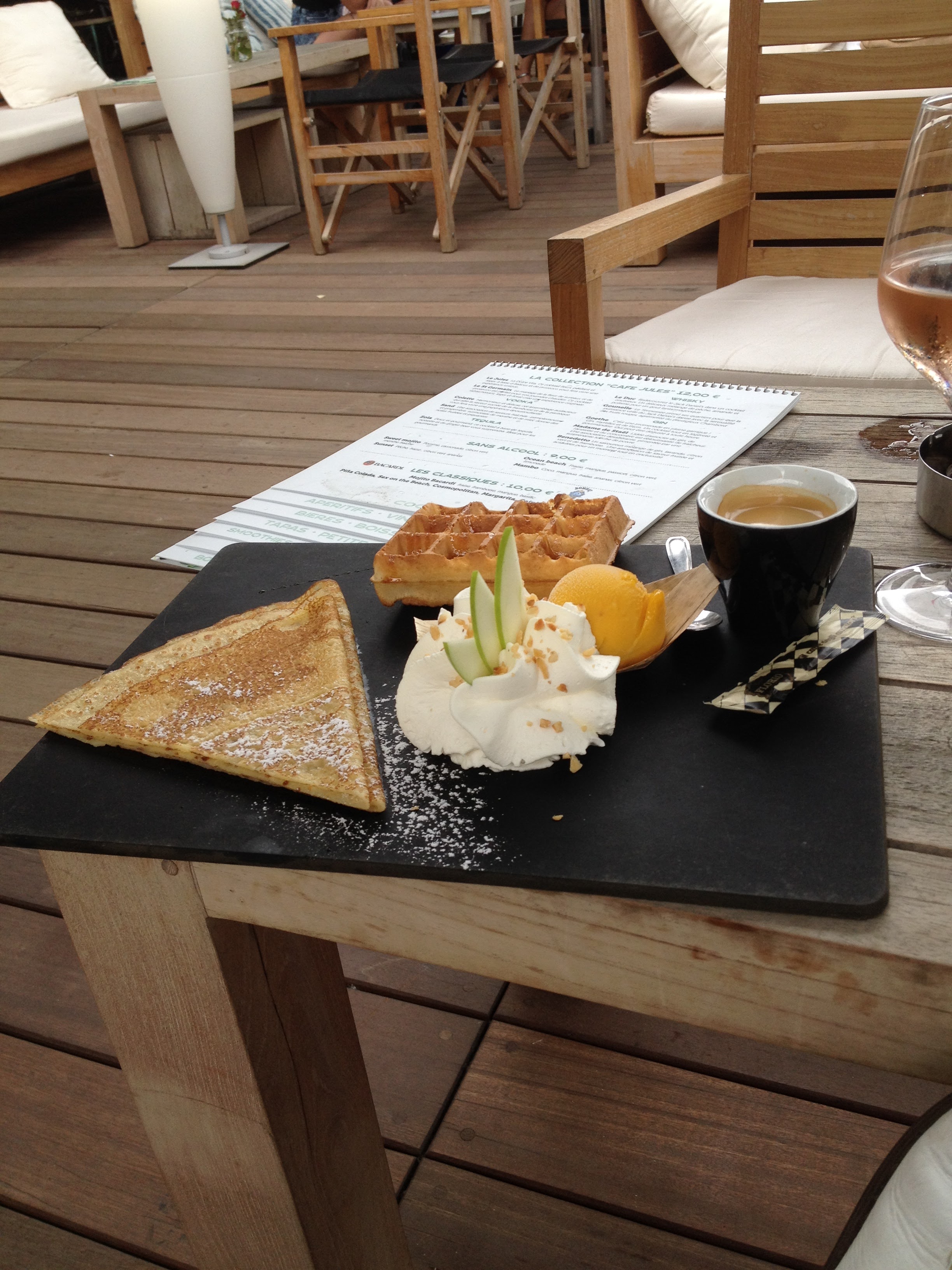 SUPER MOMENT détente au café Jules. Tres joli cadre sous l'ombre de parasols brumisateurs, canapés confortables et surtout glace maison ! Encore un tres bon moment plaisir pour les papilles... velouté courgette menthe excellent et pas cher 5€ et saint pierre tres bien préparé avec semoule orientale . Dommage que le service ait été trop long vraiment trop long... bon excuses faites par un kit offert. Encore un EXCELLENT moment devant le viennois du café jules sous les parasols au son d une très belle musique d ambiance ! Excellent moment dans un endroit branché avec des mets aussi bons que frais. A faire et à refaire !