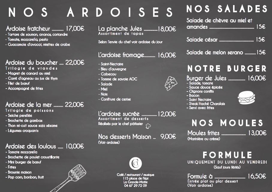 Voici toutes les informations sur le Bar à tapas Café Jules - Bar à Tapas - Restaurant - Bar à cocktails La Grande-Motte - Hérault qui ce trouve au 115 All. de l'Épi, 34280 La Grande-Motte (34). Sur cette fiche vous trouverez les photos, l'adresse, les horaires d'ouverture, le numero de téléphone et les avis clients.Vous pouvez églement rédiger un avis si vous le souhaitez en bas de page.