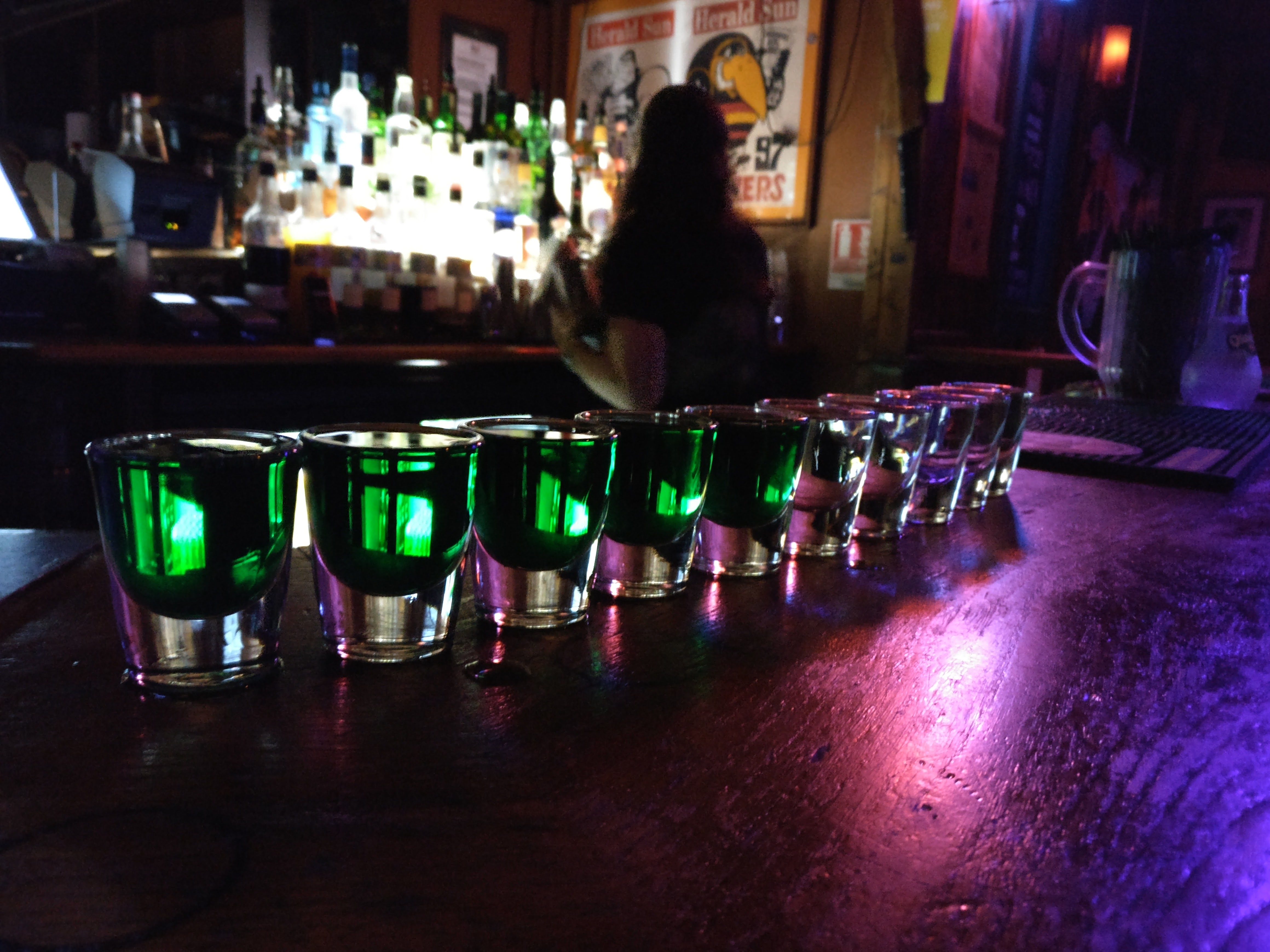Chouette pub australien très vide en début de semaine. Des urinoirs originaux. De la place et un personnel très sympa.