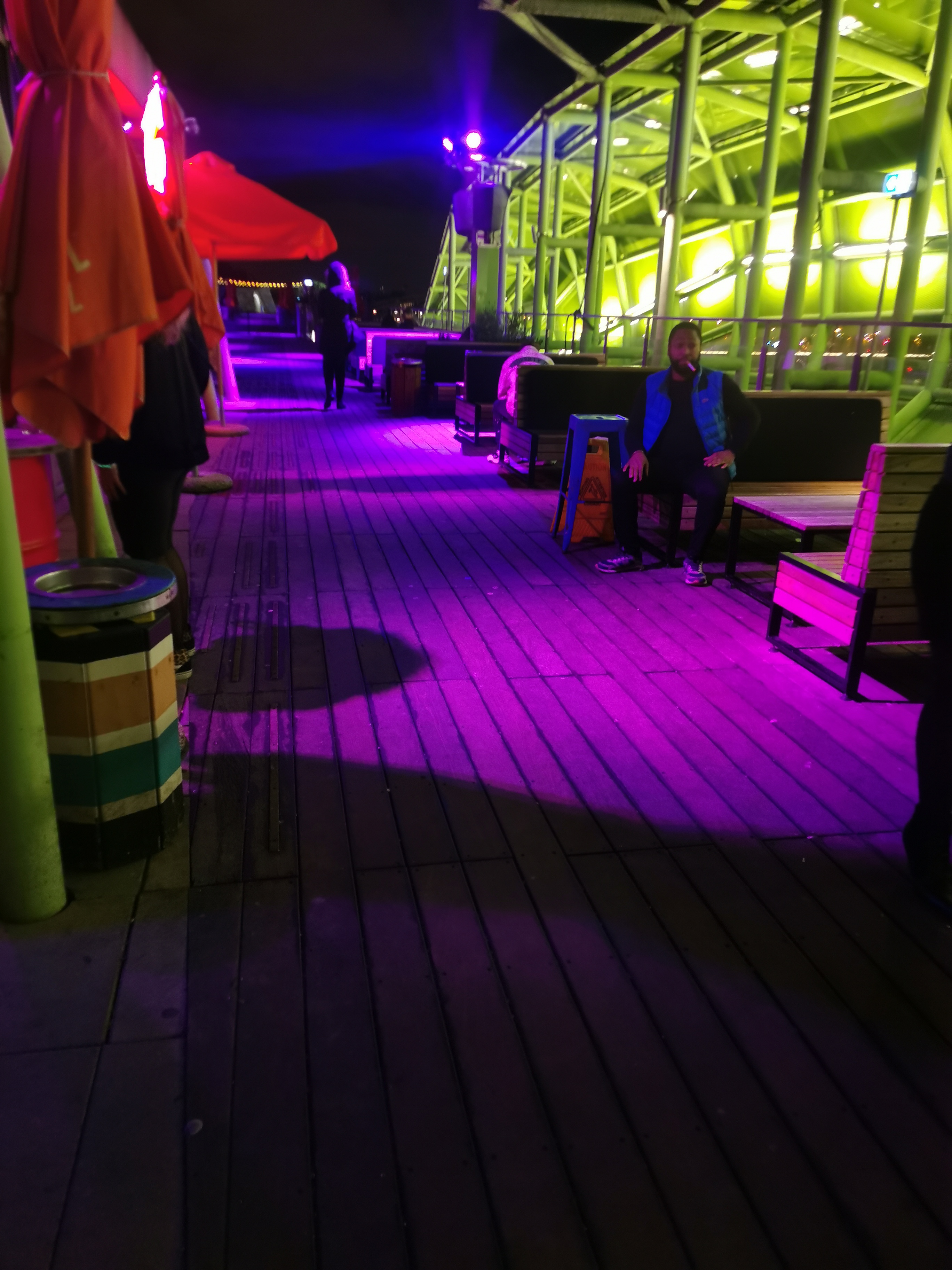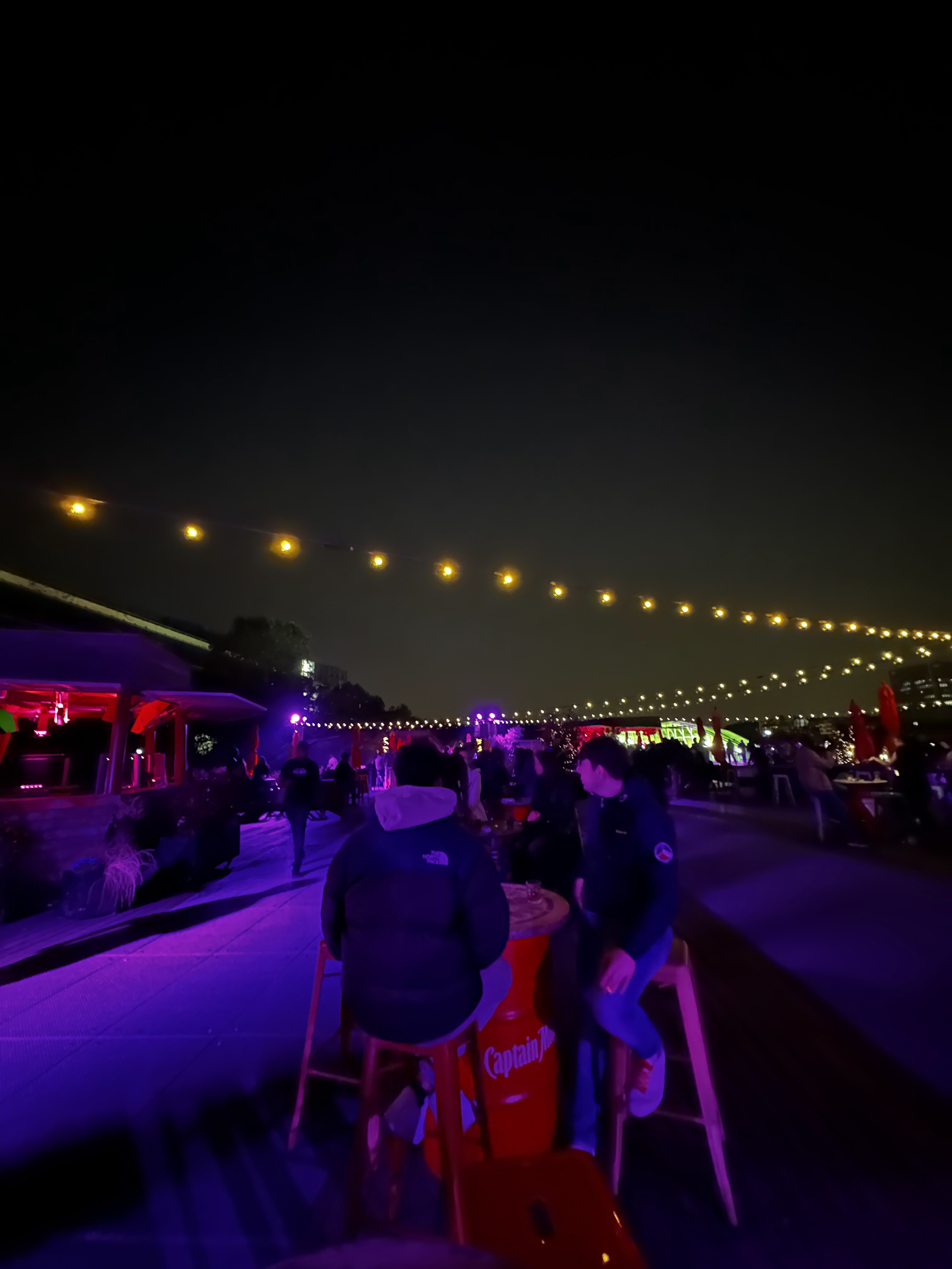 Bonne ambiance, possibilité de manger. Méga pizza à 30e et panier de frites 7e. Pour les budgets modestes en partageant la note , on s'en sort bien. Rooftop immense et appréciable.