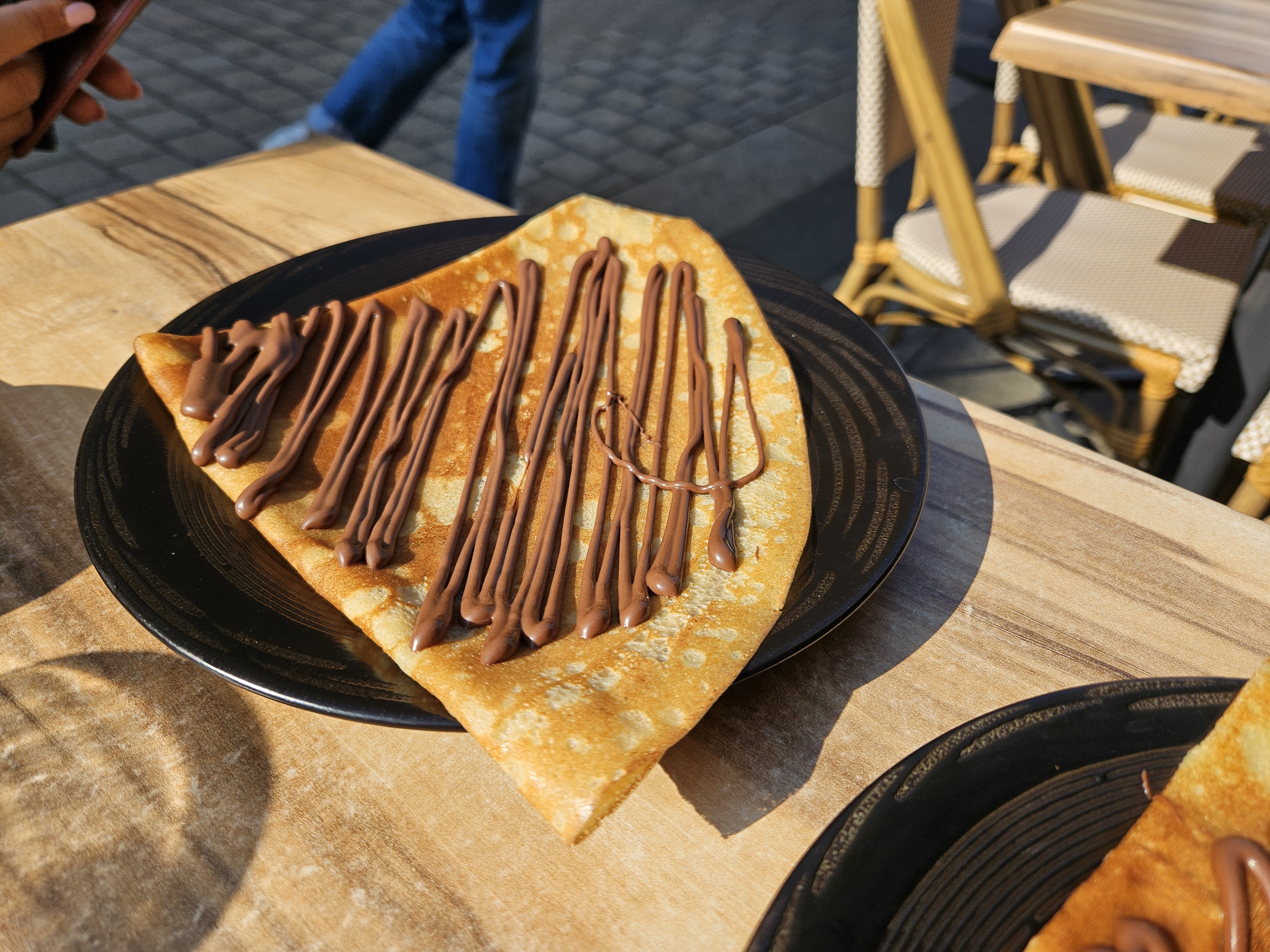 La terrasse de ce Café sent l'urine. C'était le premier arrêt. J'ai commandé un chocolat chaud qui a fini par avoir le goût d'eau chaude. Il y avait des morceaux de chocolat en poudre non dissous au fond, démontrant un manque d'attention dans la préparation de la boisson. J'ai aussi commandé une crêpe au chocolat qui était tout à fait correcte. Bien que je lui dise bonjour, souriante et polie, la serveuse était si impolie que j'avais l'impression de la déranger en passant une commande ; et je me suis demandé si j'aurais dû m'excuser d'être assis à cet endroit. Dans l'ensemble, c'est une mauvaise expérience, reflétée dans mon avis d'une étoile.