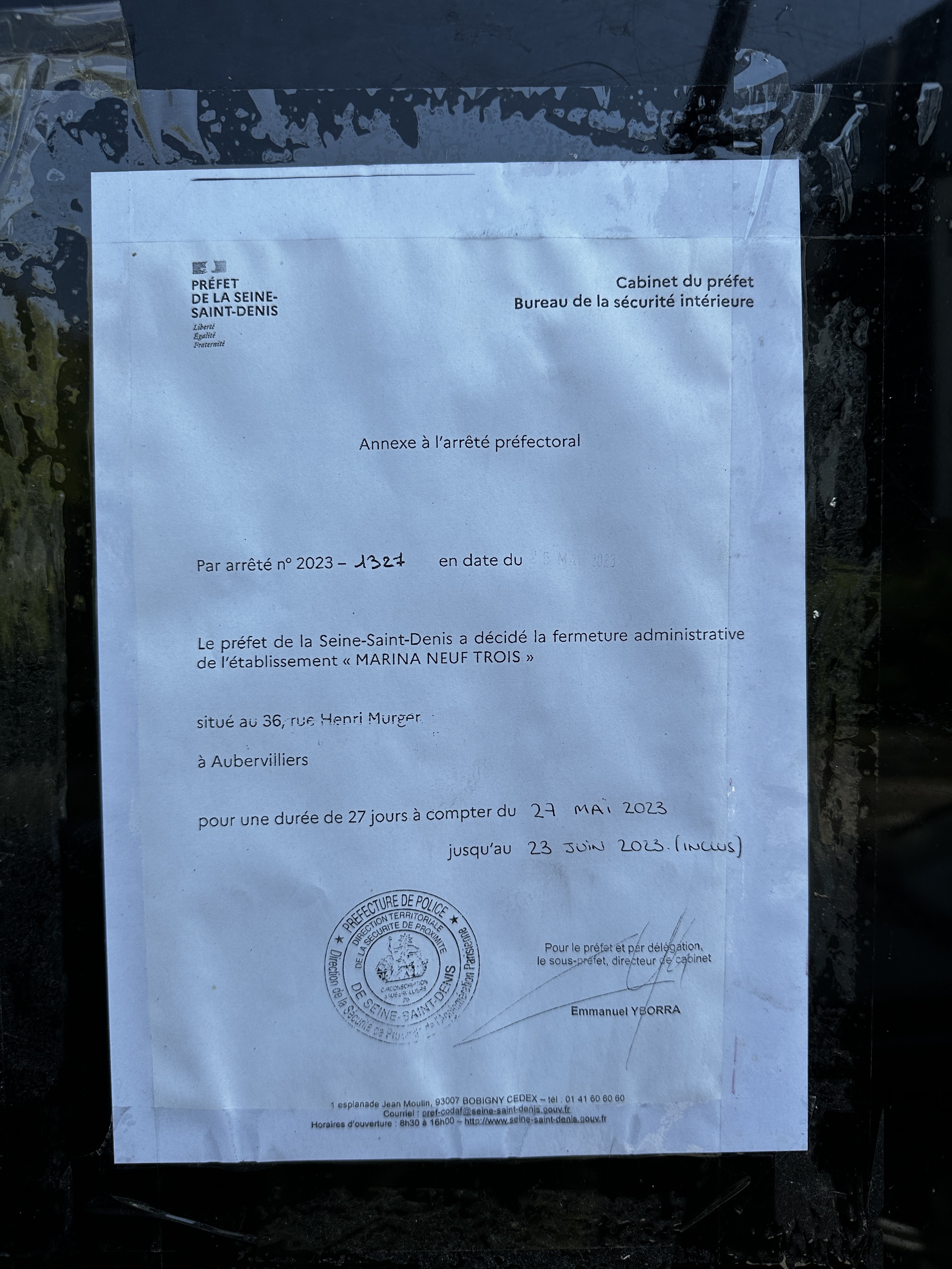 A été fermé par un avis bien visible sur le devant de la place par le gouvernement/la police. J'ai demandé à Google de marquer le lieu temporairement fermé, mais il continue de me demander un avis. Voici mon avis : aucune indication de la part des propriétaires quant à leur fermeture, que ce soit sur les réseaux sociaux, ou sur Google lui-même, donc aucun intérêt à revenir. Réponse au propriétaire : J'appose copie du Par arrêté n° 2023 - 1327 à mon avis. On y lit en outre : « Le préfet de la Seine-Saint-Denis a décidé la fermeture administrative de l'établissement « MARINA NEUF TROIS » ». Celui-ci est apposé à l'extérieur de votre établissement. Il se peut qu’en tant qu’administrateur de réseaux sociaux, vous ne sachiez pas ce qui se passe au niveau local, alors merci pour l’attaque. Cela montre simplement le niveau d’établissement et pourquoi personne ne devrait jamais le visiter.
