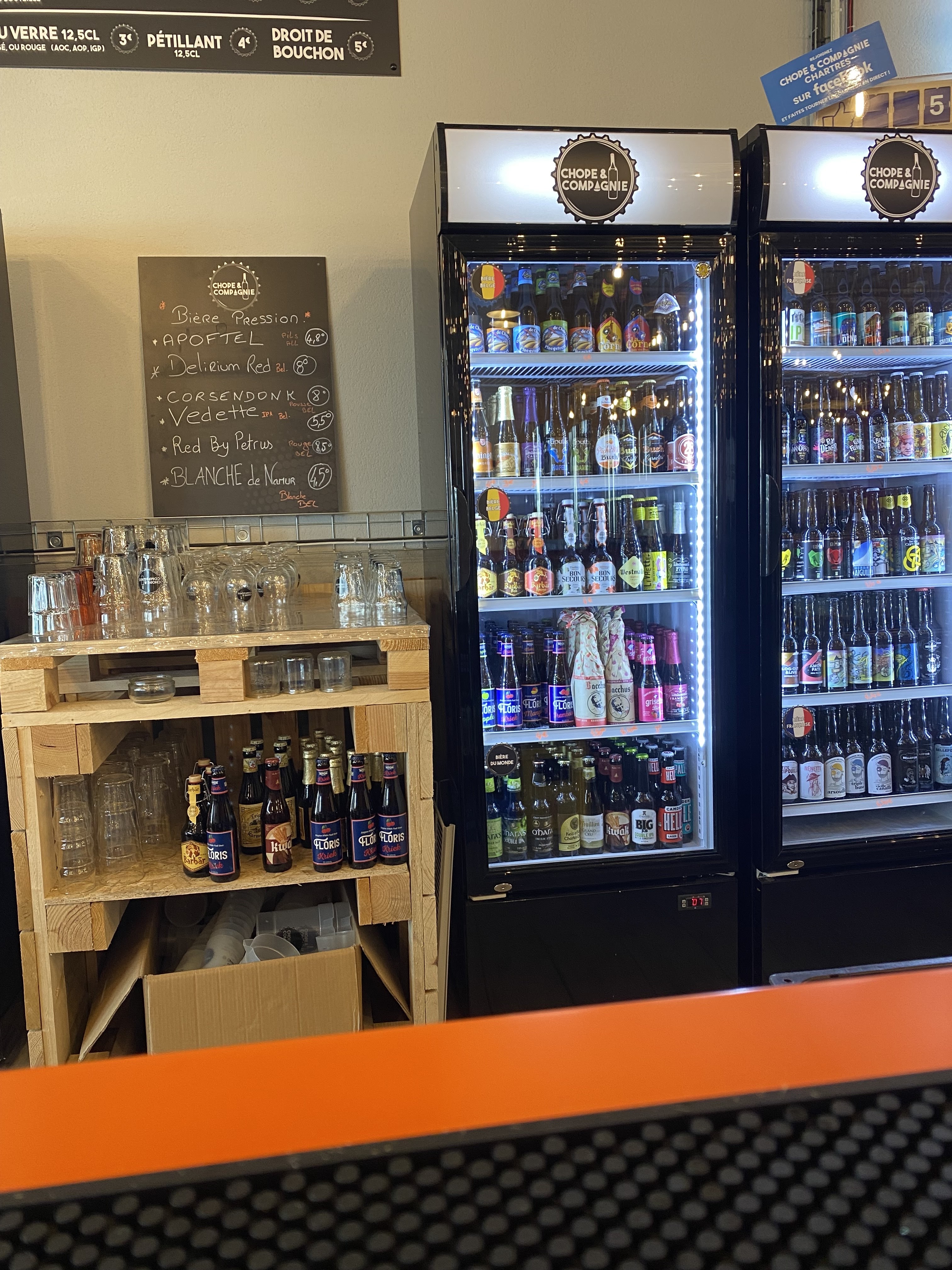 idealement situé (très facile pour se garer et eviter le centre ville de Chartres). lieu climatisé et vaste. Des bieres a gogo mais pas seulement. Le serveur est de tres bon conseil 👍
