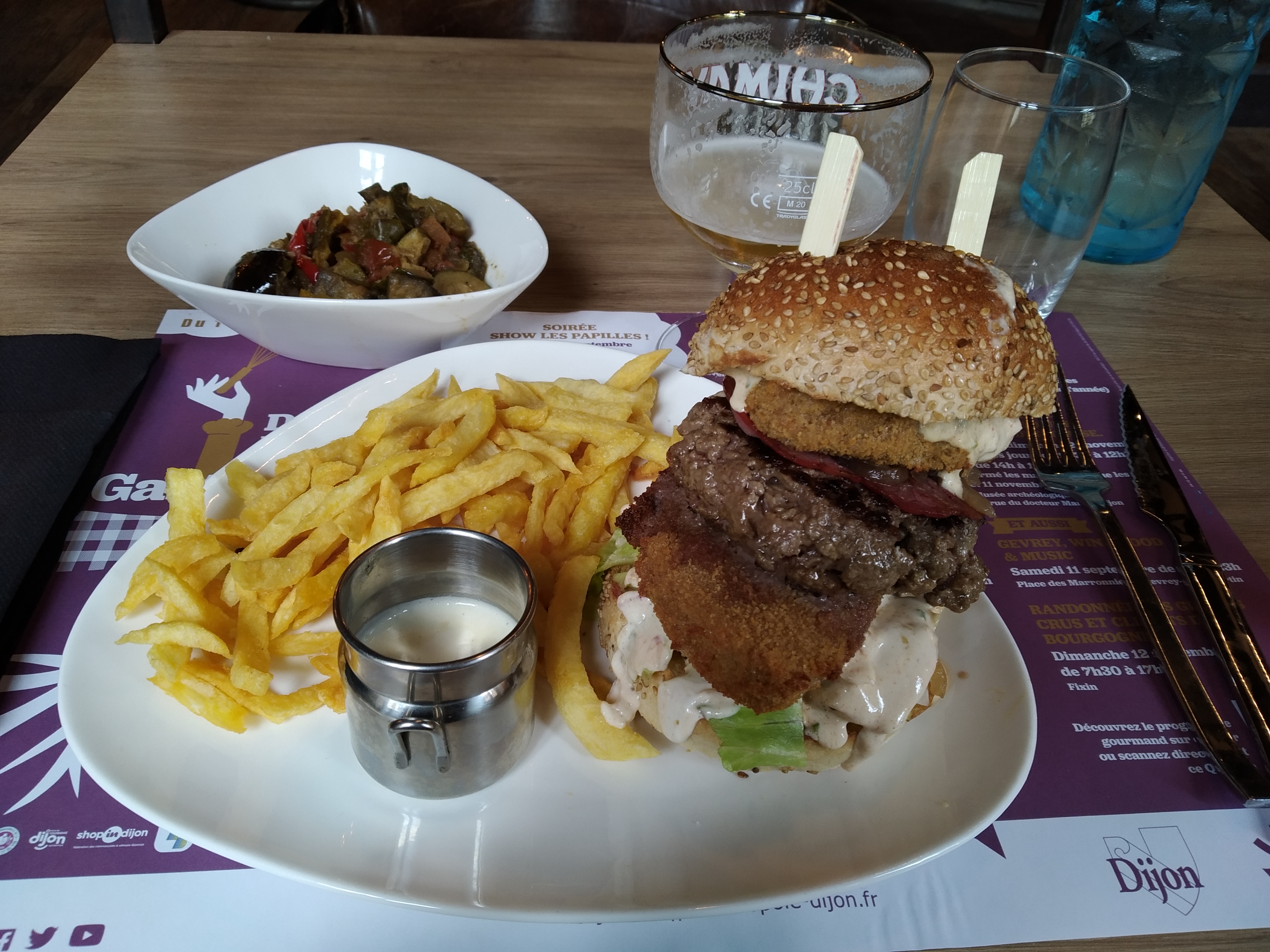 Hamburger Colonel Flakes au top copieux et savoureux je ne suis pas fan des frites à la graisse de bœuf trop cuites à mon goût mais ça reste mon goût j ai pris une bière sans alcool à la framboise pas trop de goût de bière mais pas sucrée par la framboise chimique Parfait ! Même à 14h30 le serveur est agréable et courtois sans afficher sa fatigue alors que beaucoup d autres resto ne prenaient plus de clients à 13h30. Merci