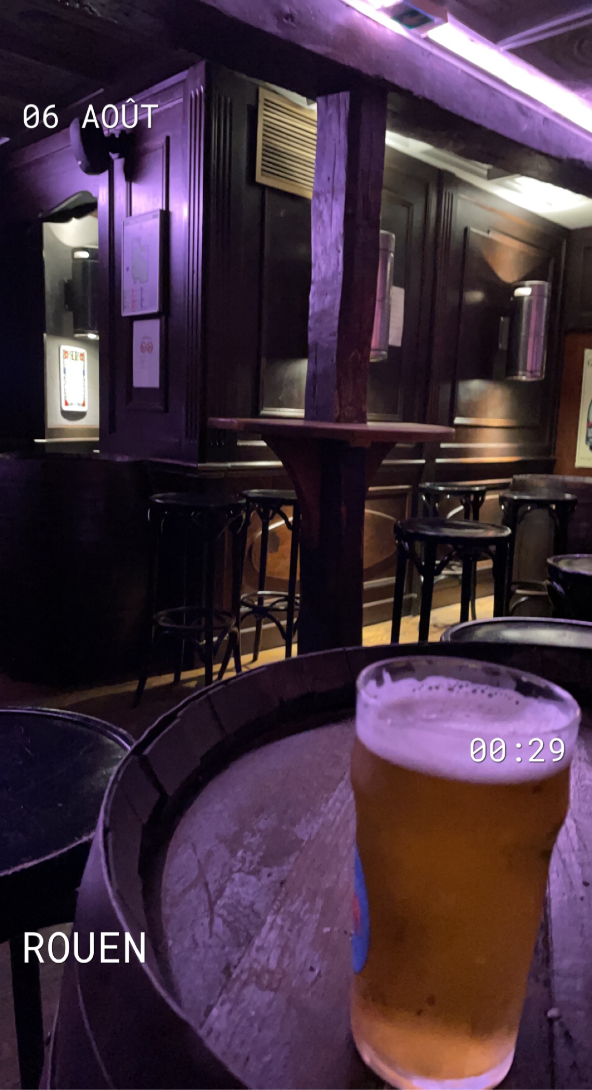le bar est sur 3 étages, est très très bien placé dans la rue du gros horloge il a une très bonne ambiance, tous serrés assis sur des chaises hautes avec des tonneaux en guise de tables les serveurs sont cools, proposent une grande variétés de pintes ou pressions différentes (personnellement je me suis laissée guider) j'y retourne sans hésiter