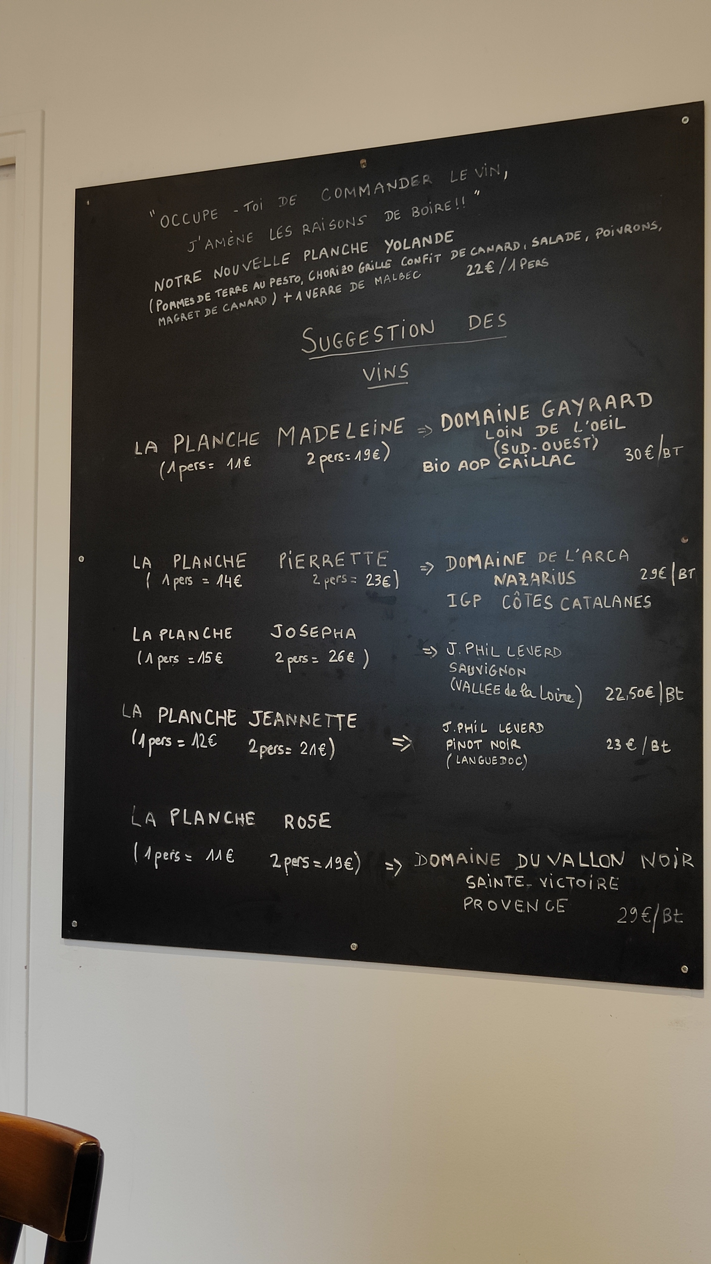 A ne surtout pas manquer! Nous nous sommes régalé les planches sont variées copieuses très bien présentées et il y en a pour tous les goûts. Les produits sont frais et la qualité est au rendez-vous En plus des différentes planches vous avez un menu du jour fait selon la sélection du chef je me suis régalée avec une entrée <<œuf mollet enveloppé dans une fine panure sur crème de fondu de poireaux et comté le tout gratiné au four >> Et le dessert était largement à la hauteur Les vins sont de qualité et à un prix tout à fait abordable Les hôtes sont très accueillants et prêts à vous conseiller pour le choix des vins ou planches si vous le désirez. Et en plus le rapport qualité est prix est excellent Nous avons passé un super moment nous y retournerons avec plaisir !!