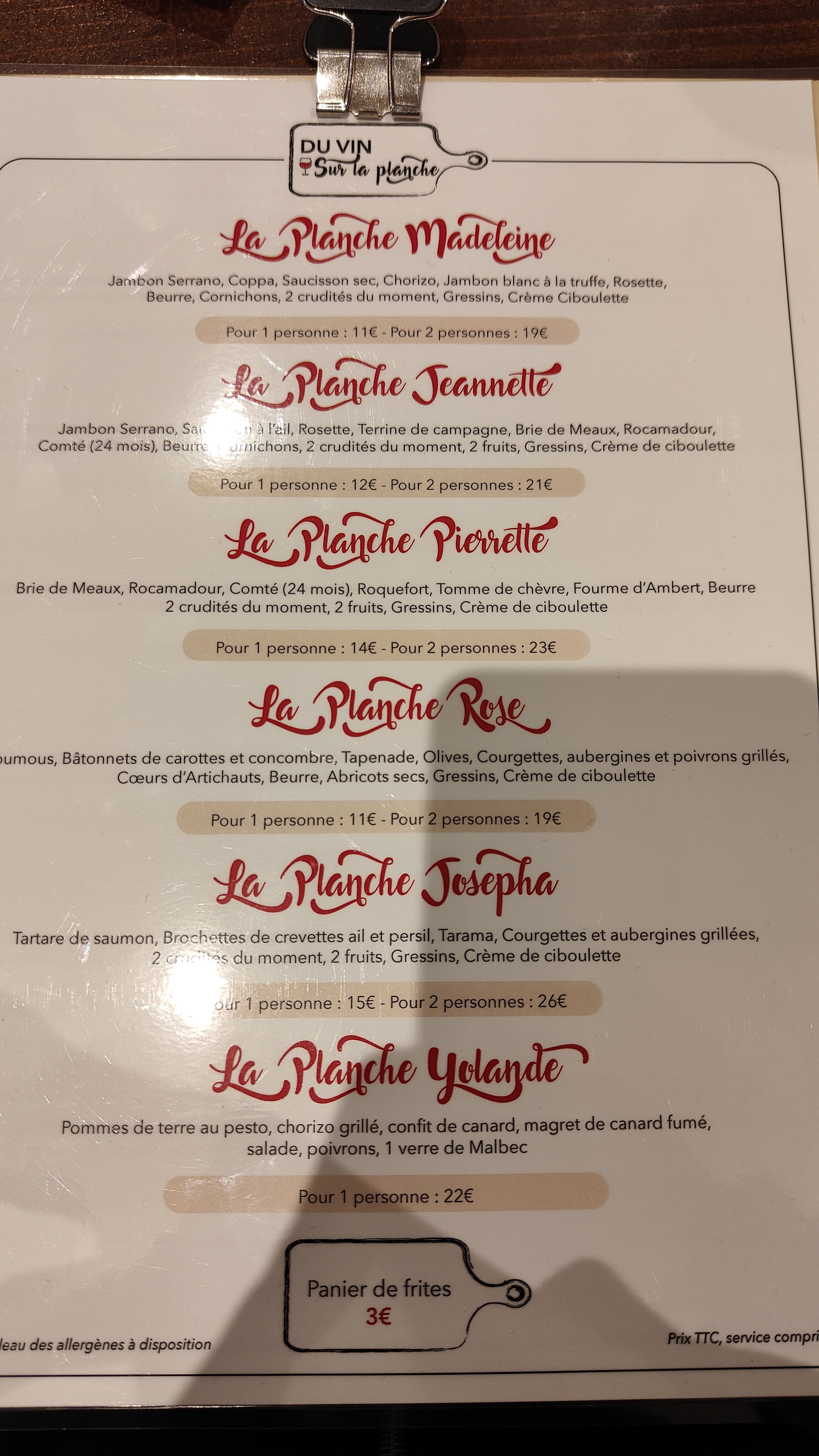 Ambiance agréable avec un service efficace. Les planches sont variées, il y a bien évidemment les classiques charcuterie ou fromage mais également des plus élaborées : la Josepha est très bonne. Tarifs raisonnables compte tenu de la qualité des produits.
