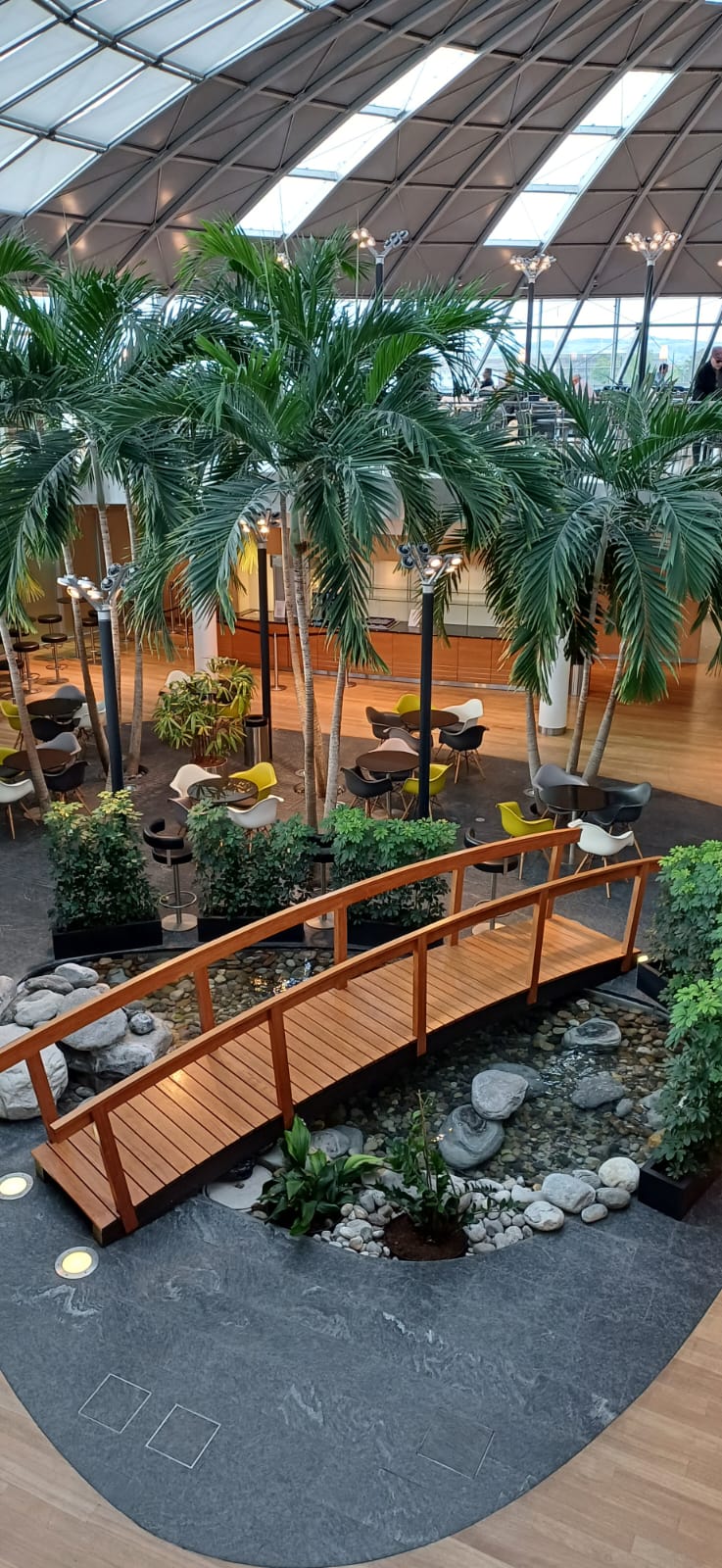 Très joli lounge avec beaucoup de verdure. La vue est top pour celles et ceux qui veulent un peu de calme ou se restaurer avant de prendre leur vol. Par contre niveau nourriture je trouve le choix limité il manque le fromage à mon goût 🙃
