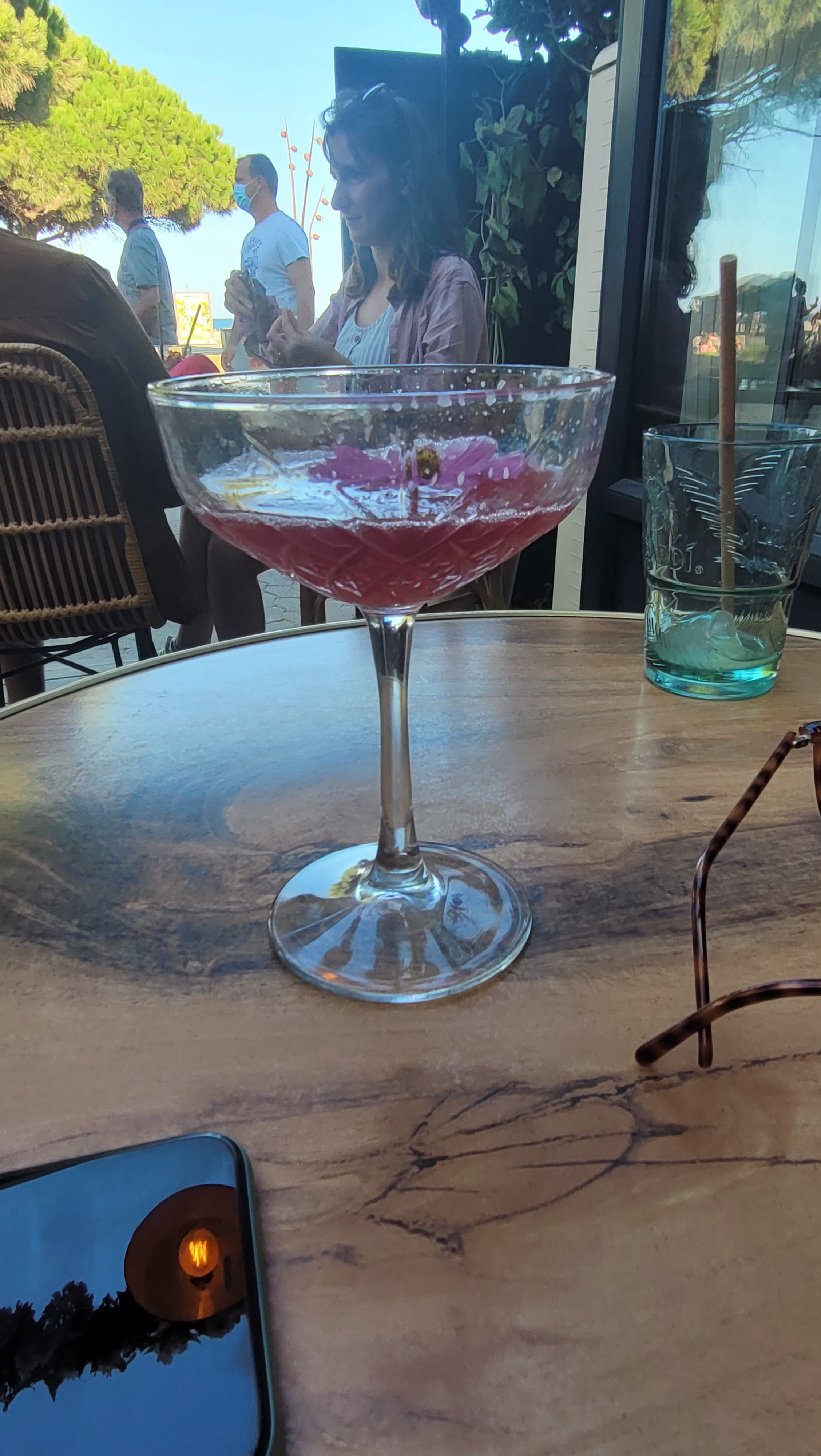 Avec mon amoureux un apero. Enfin 1 mojito digne de ce nom avec du rhum (et non 1 goutte) et un bagnuyls bien frais et bon. servie par Marine une adorable jeune fille souriante