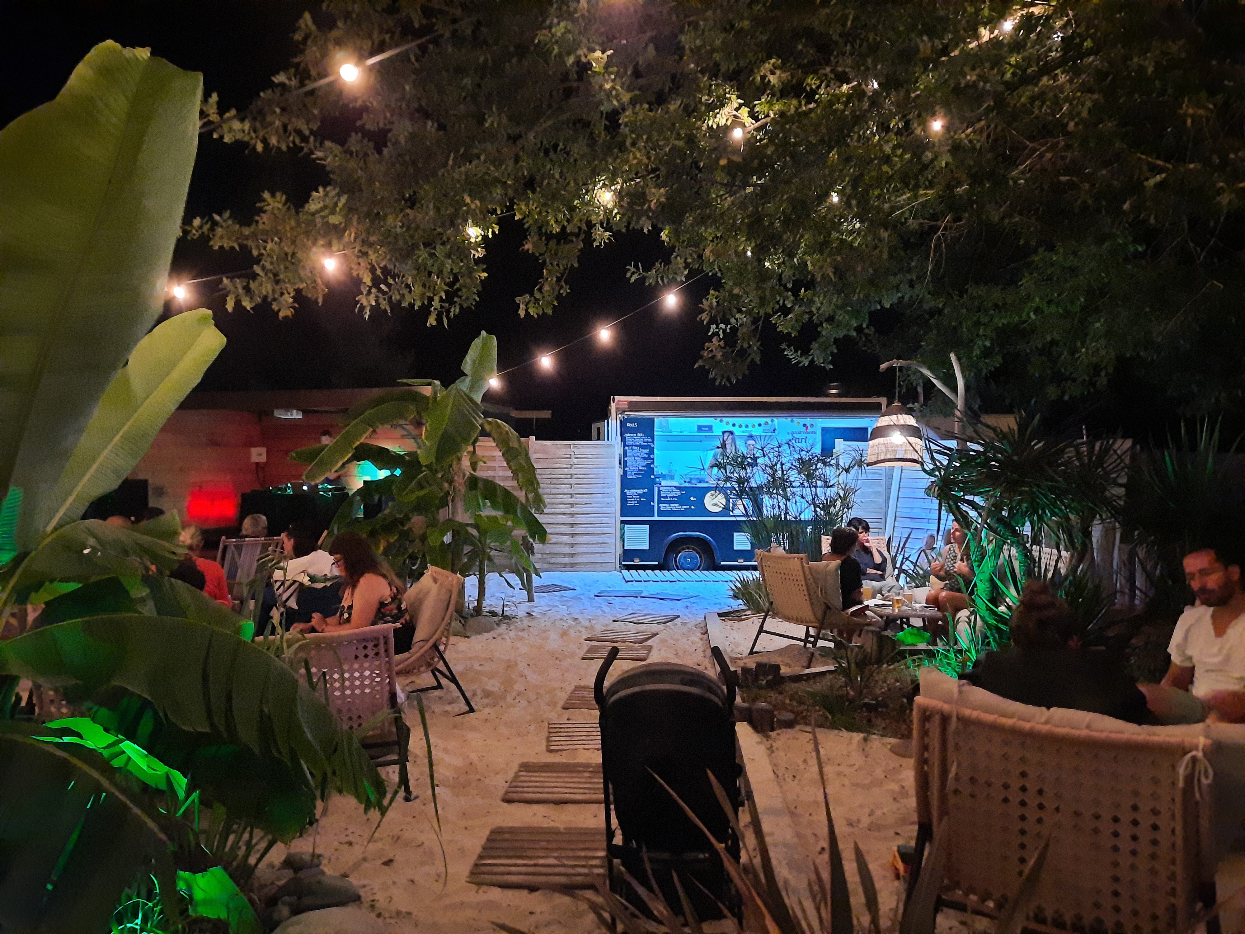 Endroit très sympa joli décor les pieds dans le sable, nous n avons pas goûté le food truck mais les glaces très bonne dommage ils ne font pas les coupes. Tarif habituel du moment. Soirée animée certains soirs dommage pour nous soirée annulée pour cause d'orage.