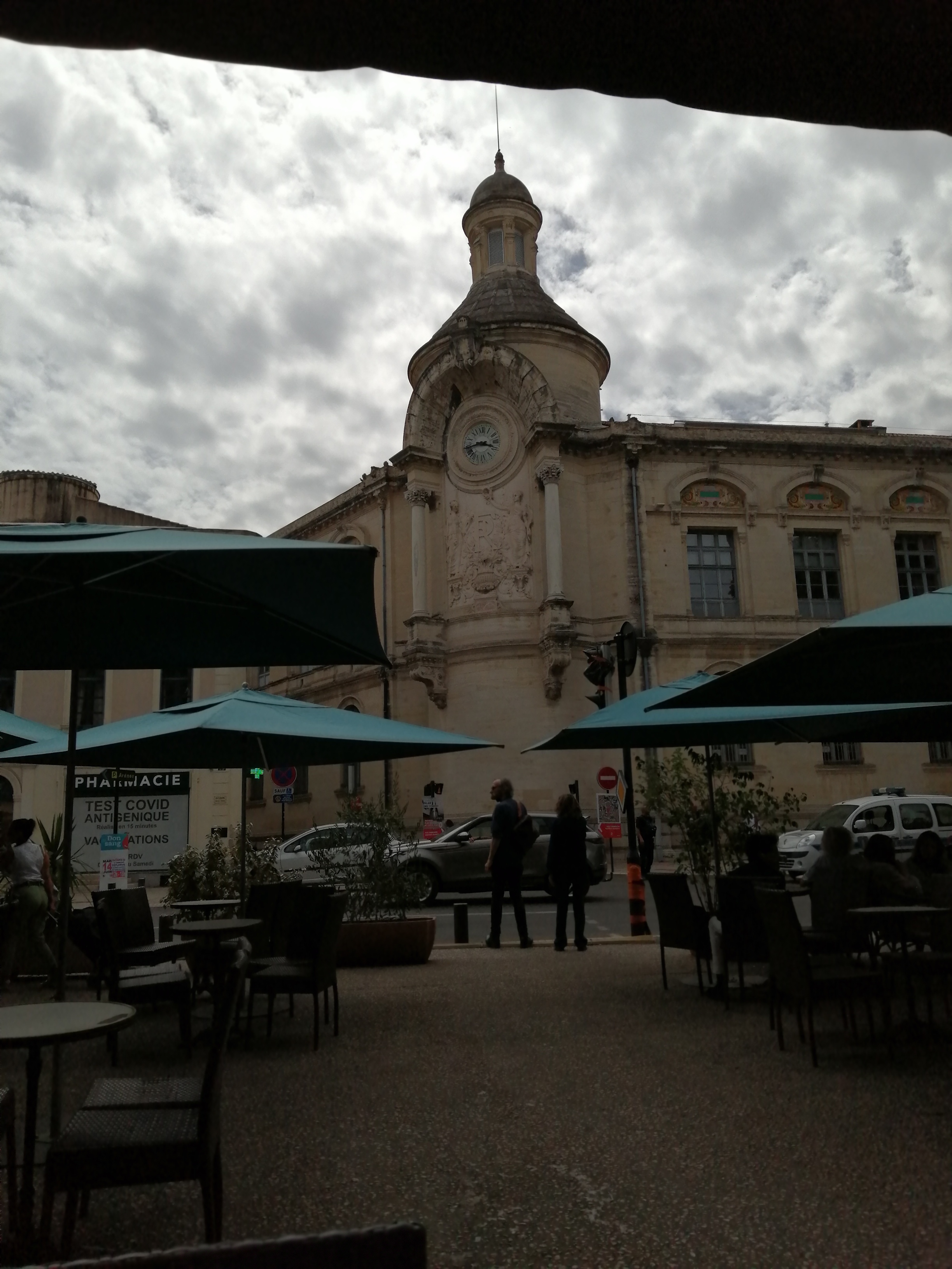 Un café avec une grande terrasse ombragée. Splendide vue sur les arènes de Nîmes. Accueil sans plus. Prix normaux.