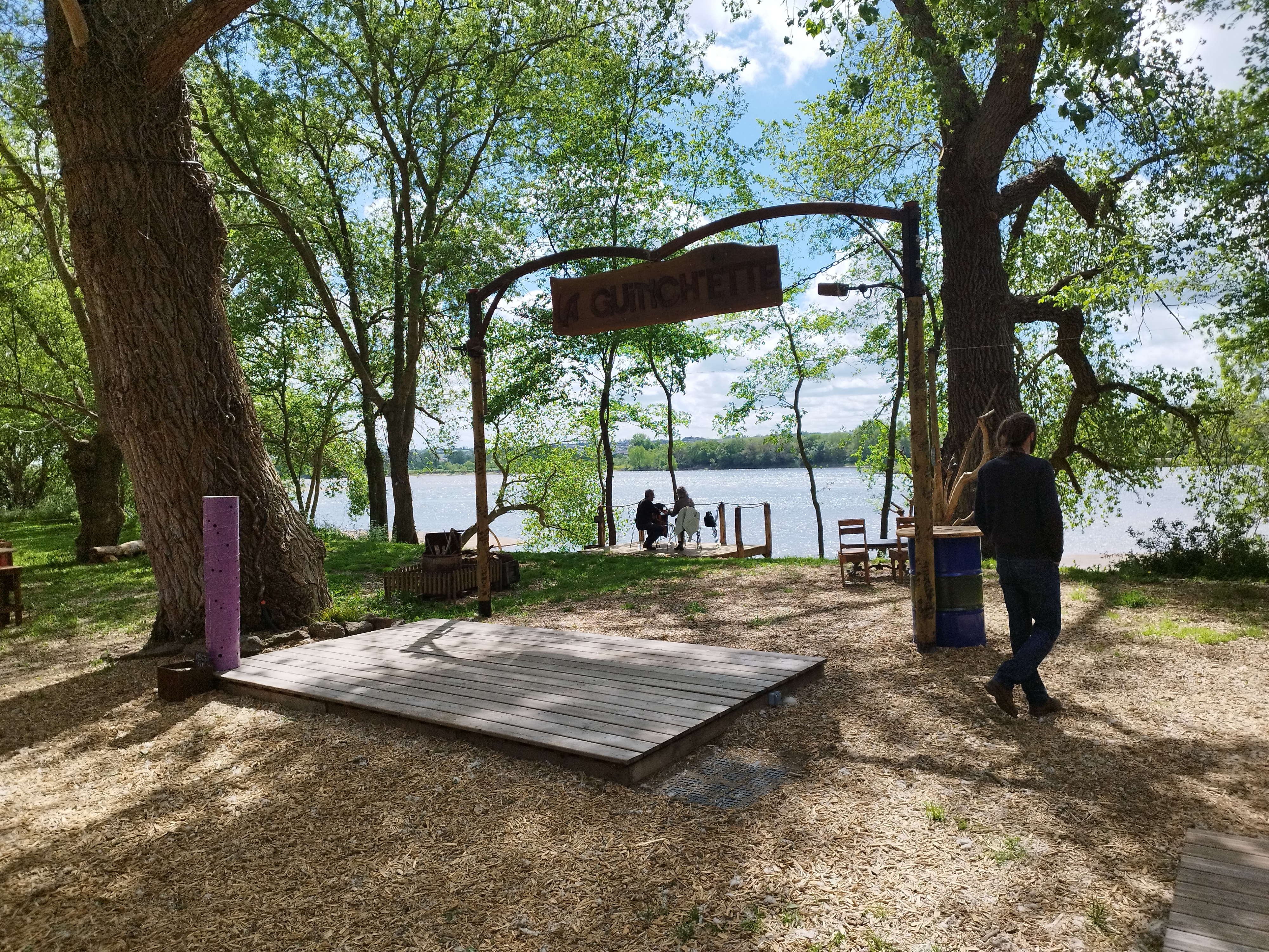 Sur les bords de Loire, quand on roule à vélo et s'il fait 36°, la halte est agréable, suis les grands arbres. Desmeubles fait de palettes, mais aussi des canapés, des hamacs dans les arbres, des bidons n'attendant plus que le feu pour faire de la lumière le soir ou pour faire des grillades, un bar avec des gens sympas si vous tutoient d'emblée, des jeux à emprunter. Une playlist super. On se dit que passer du temps entre amis sur le bord de Loire à faire des jeux, à manger et boire un coup est bien agréable. Ça donne envie d'y retourner plus longtemps que juste pour boire un café à l'ombre...