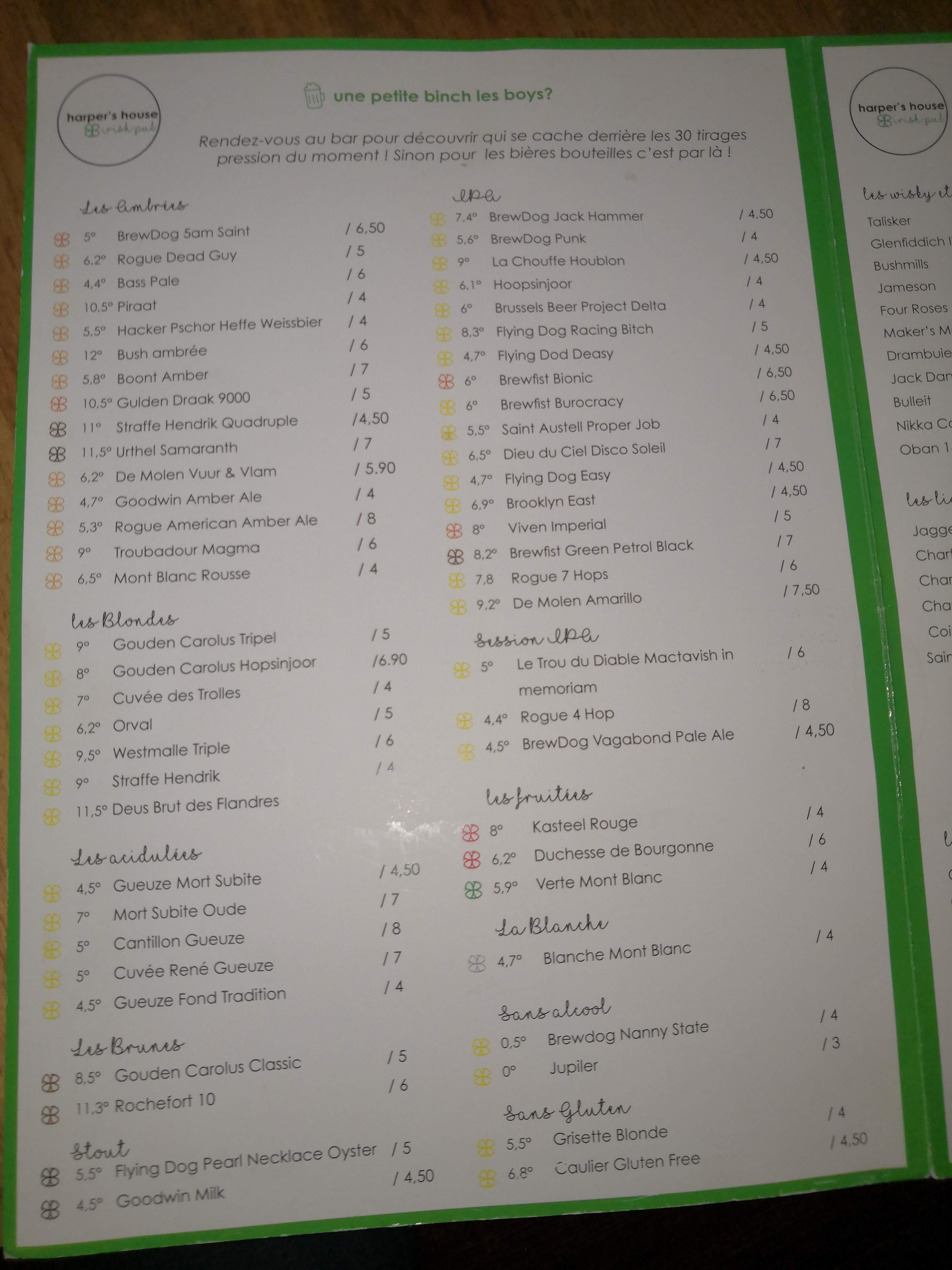 Très bon bar, à prix très abordable. Un large choix de bières pressions / bières en bouteille. De la nourriture disponible des nachos en passant par le saucisson, la terrine et des plats plus consistant (via le Harper's Cantina) Un service de qualité, service à table et/ou au bar. Un terrasse disponible en été, des sièges confortables. La musique vous fera voyager en Irlande. En bref, je vous conseille ce bar !