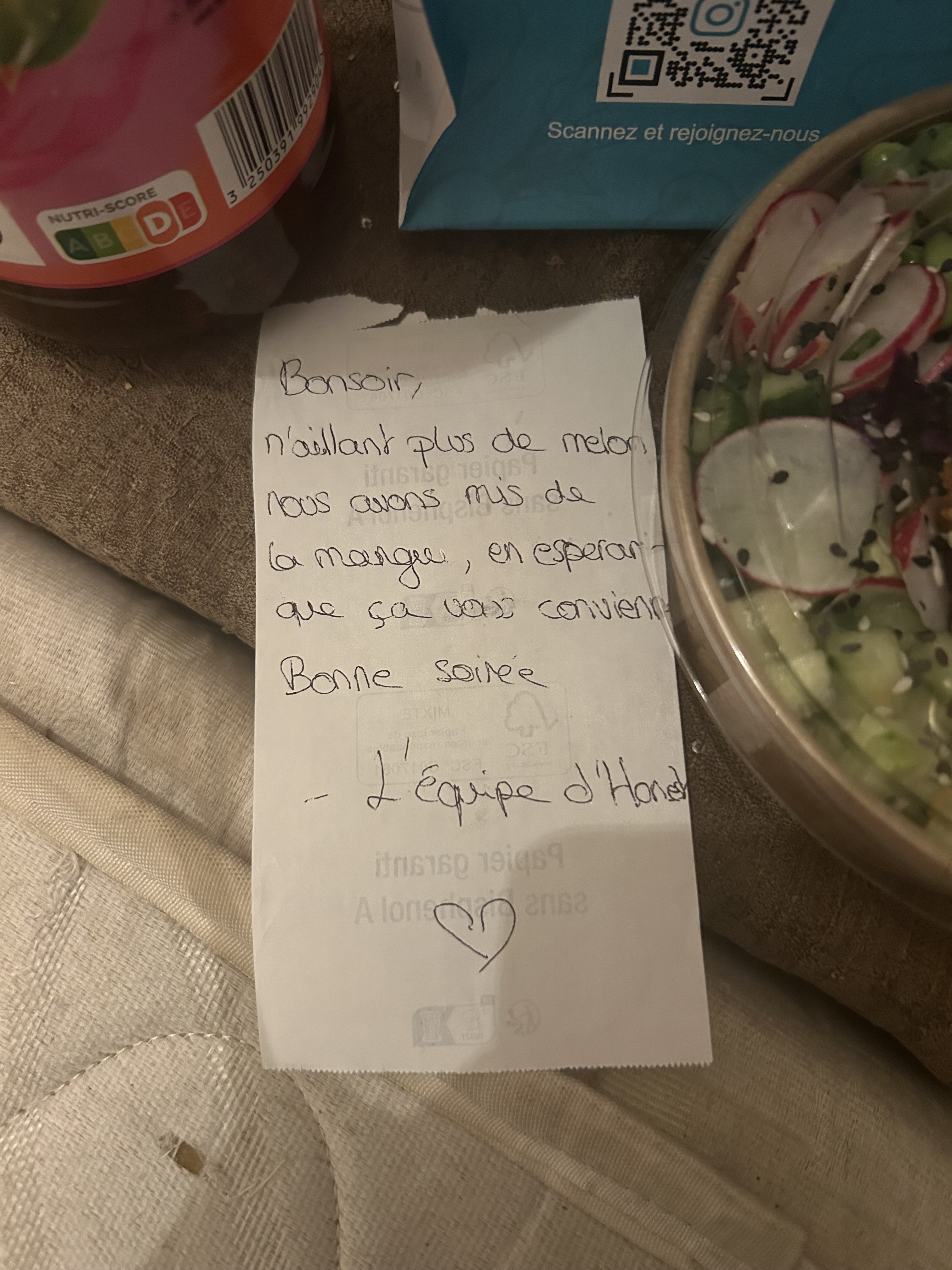 Je tiens à remercier l'équipe du Honest Bowl de Nice suite à notre visite du 19 août à midi. Les serveuses ont fait preuve d'une grande gentillesse en nous offrant de l'eau. Leur amabilité et leur serviabilité ont grandement contribué à rendre notre repas plus agréable. Le geste attentionné d'apporter de l'eau sans même que nous le demandions témoigne de leur excellent service. Merci d'avoir ajouté cette touche de confort et de convivialité à notre repas. Votre attention envers les clients est très appréciée et doit être soulignée.
