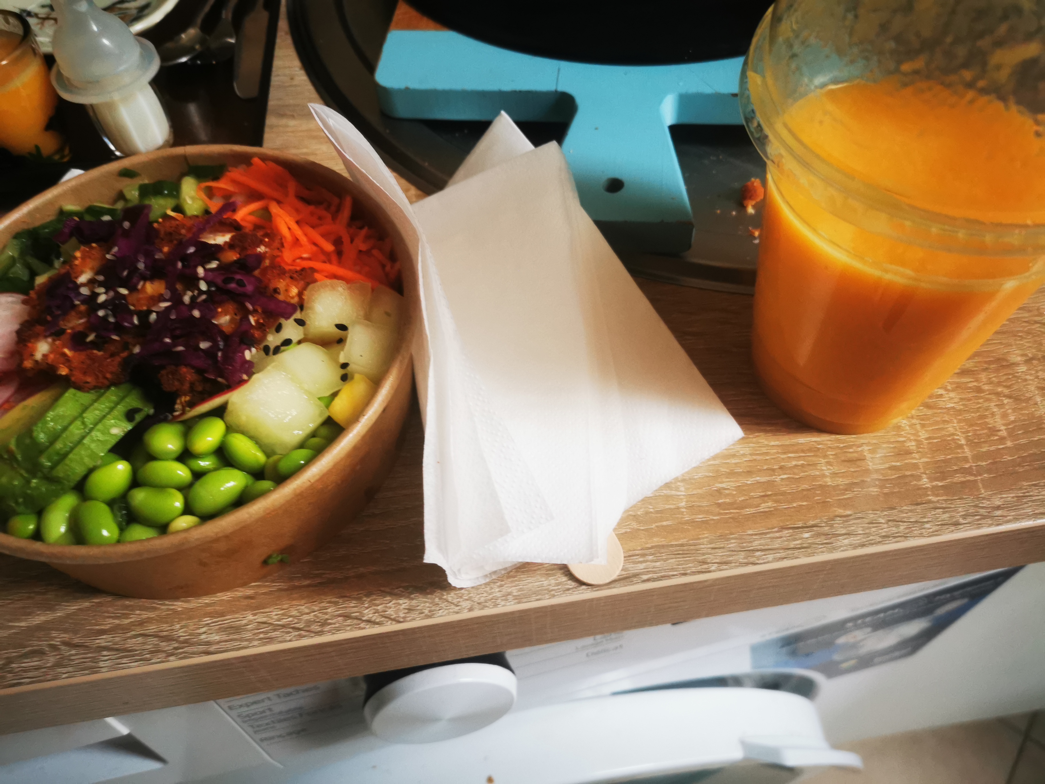 J'ai l'habitude de commander depuis chez moi des Pokés Bowls Je tiens à dire c'est bon et frais, j'ai payé 12,90€ pour les 2 barquettes que vous voyez et 7€ pour le smoothie qui est 100% frais et sans sucre ajouté Je recommande 💪