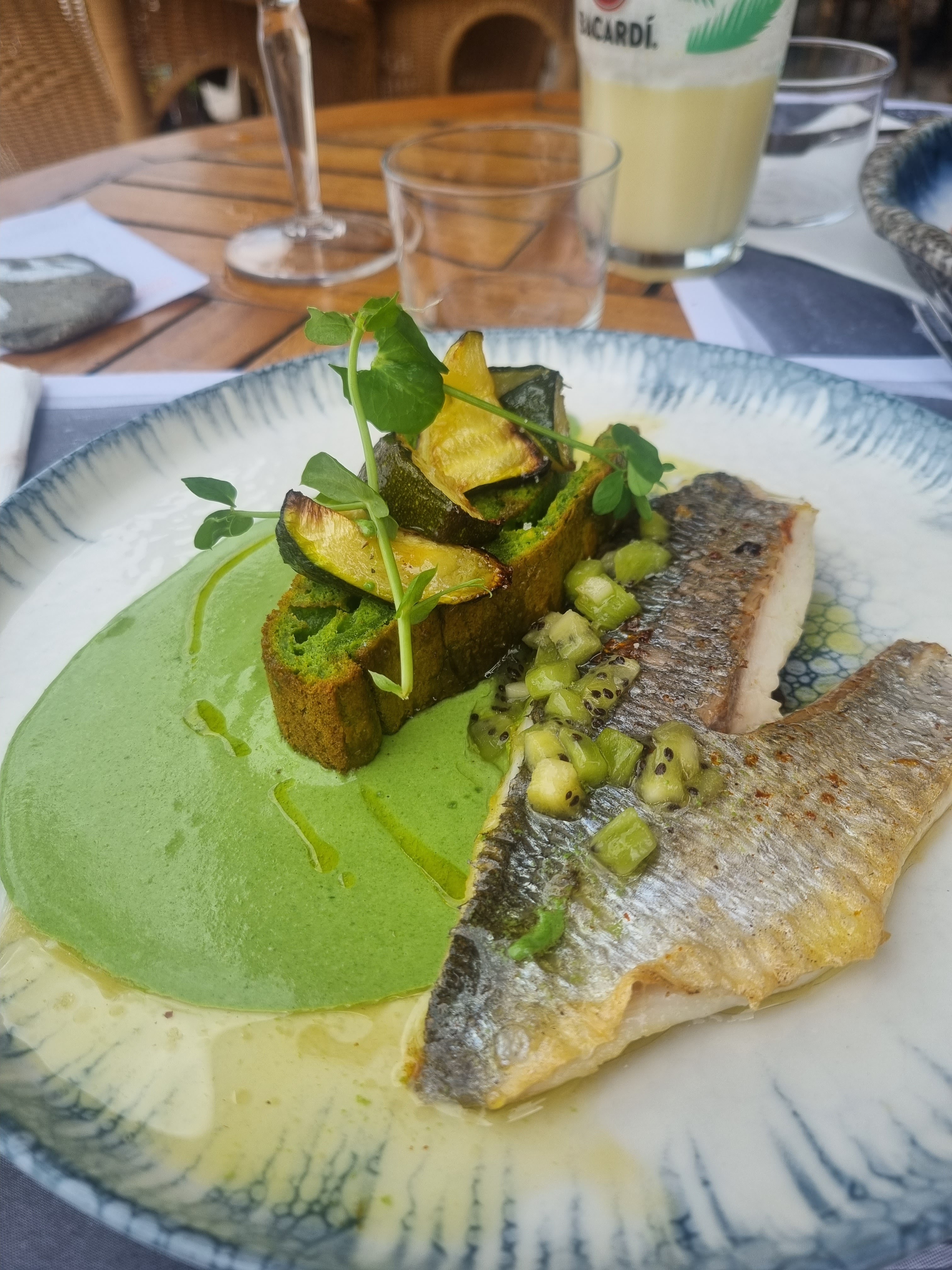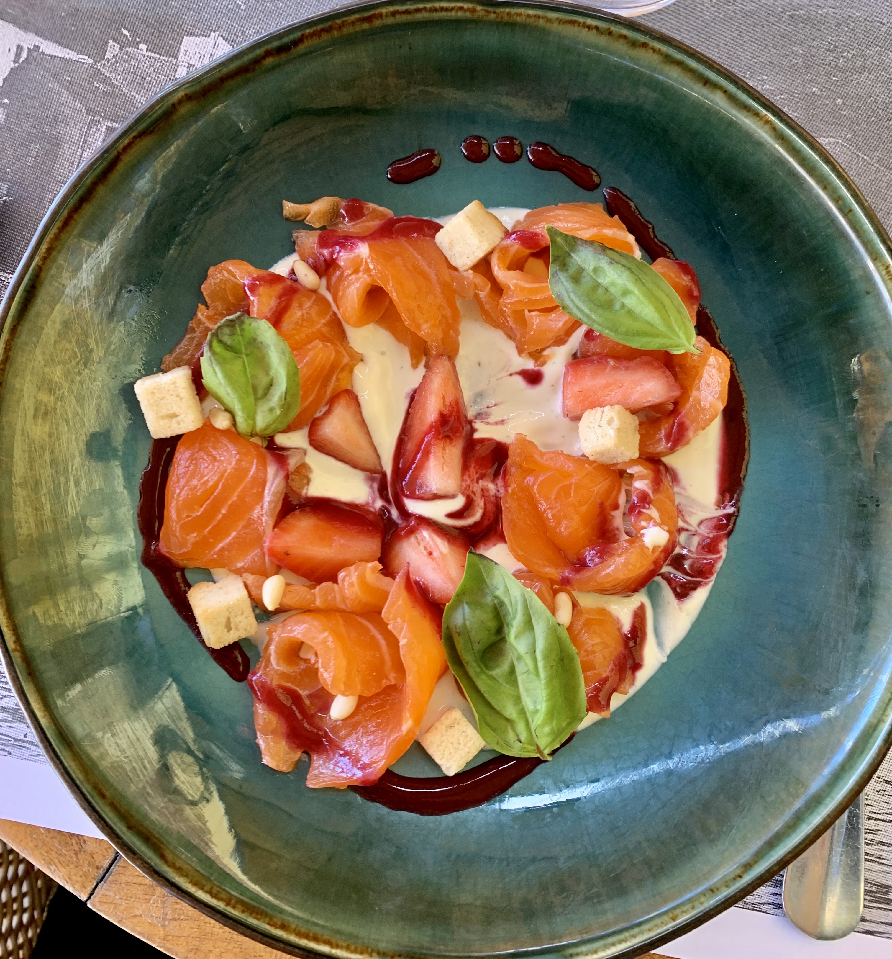 En entrée, Saumon gravlax fraises, un duo surprenant qui matche bien En plat , la dorade avec kiwi et son cake épinards, un délice gustatif incroyable! Bravo au 👩🍳 !