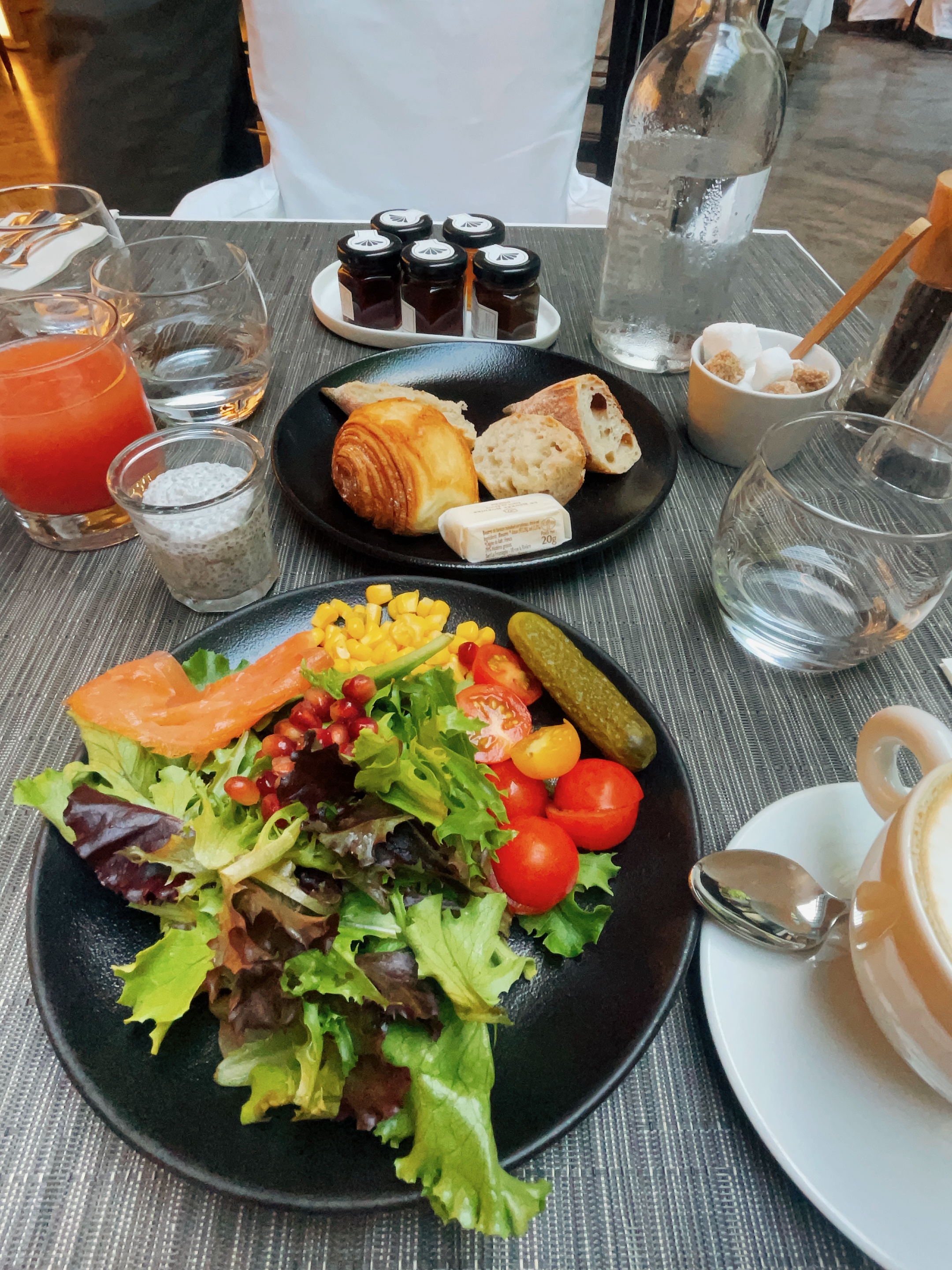 Jolie salle avec verrière pour le petit déjeuner, un mobilier design et amusant (tables !), couleurs intemporelles et élégantes, on s'y sent bien, ça met de bonne humeur pour démarrer la journée. Le personnel est aux petits soins. Des petits bouquets de fleurs fraiches sur les tables et une belle variété de produits qualitatifs pour le déjeuner (pain et viennoiseries extra, salade et jus de fruits frais). Super, on peut y voir la Tour Eiffel en se penchant un peu ! Le confort d'un lit haut, une literie enveloppante et une nuit hyper calme pour le centre de Paris, on s'attarde facilement pour la grasse matinée...ensuite, avec mon amie, on a apprécié la qualité des produits de toilette Codage