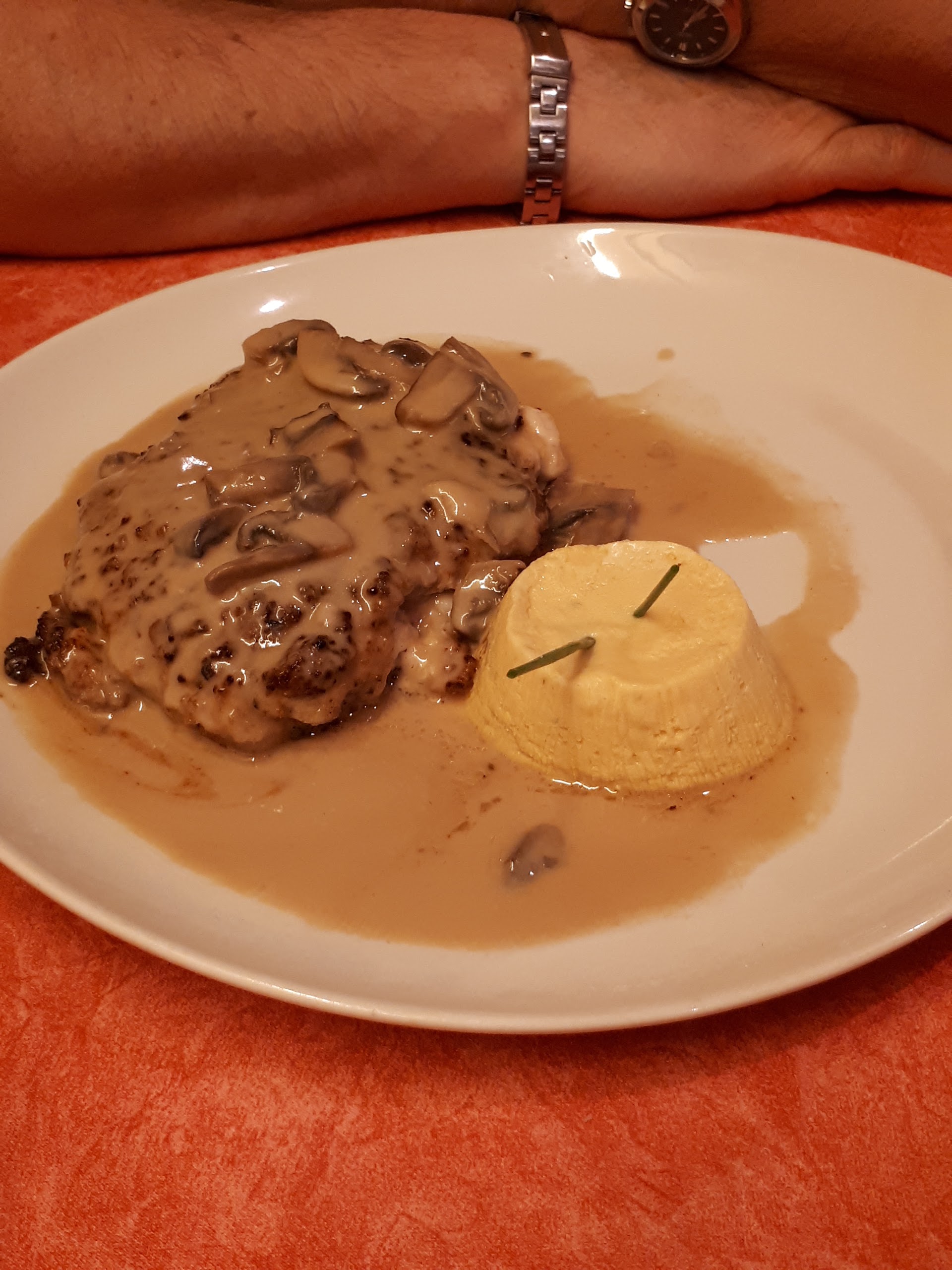 Ambiance sympathique et familiale cuisses de grenouilles a l'ail très bonnes Rognons de veau cuits comme il le faut, sauce brune un peu trop salée mais bonne