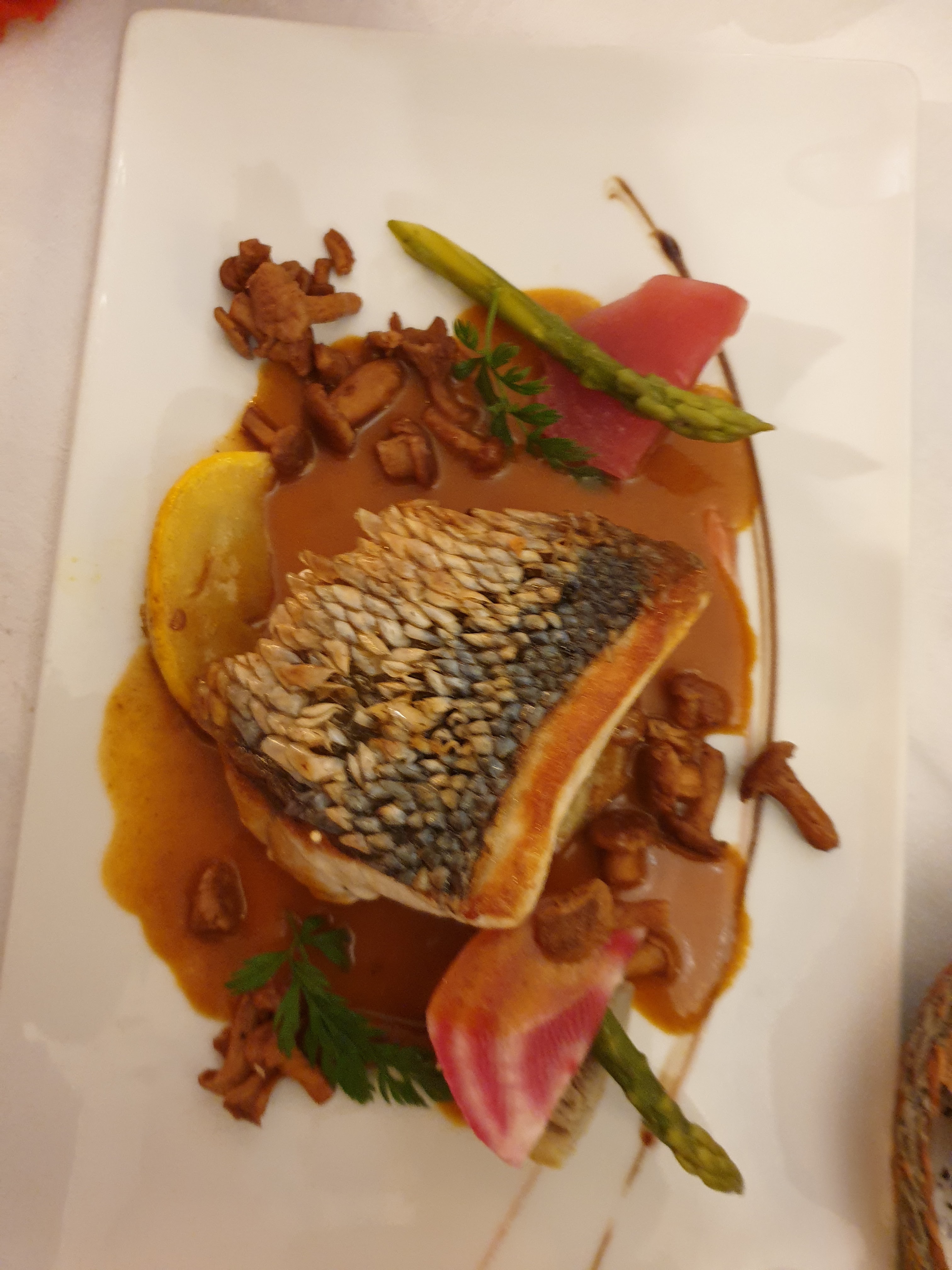 J'ai eu la prise du jour. Lotte au curry et risotto. Le poisson était vraiment super, le désert aussi. Risotto trop ringard à mon goût. J'ai néanmoins passé une bonne soirée. Le jardin est magnifique. Honnêtement, je pense que c'est un peu trop cher.