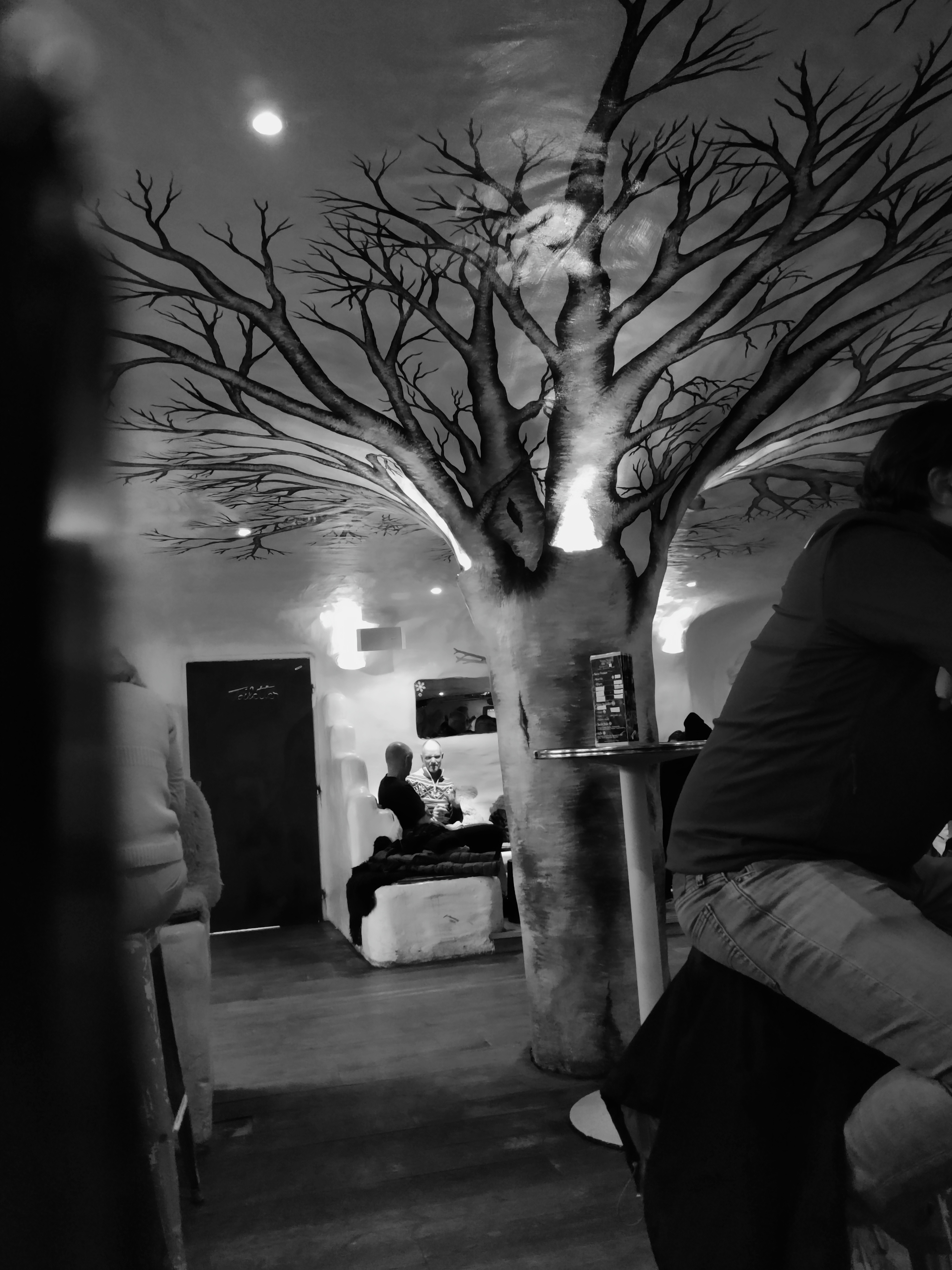 Un ICE bar où il fait chaud, avec une cheminée,des peaux de bêtes sur les murs et les banquettes. Quelques cocktails originaux. Musique de fond permettant quand même de discuter normalement. Rillettes ou pâté offert gracieusement. Personnel agréable et souriant. Rapport qualité prix raisonnable. A découvrir