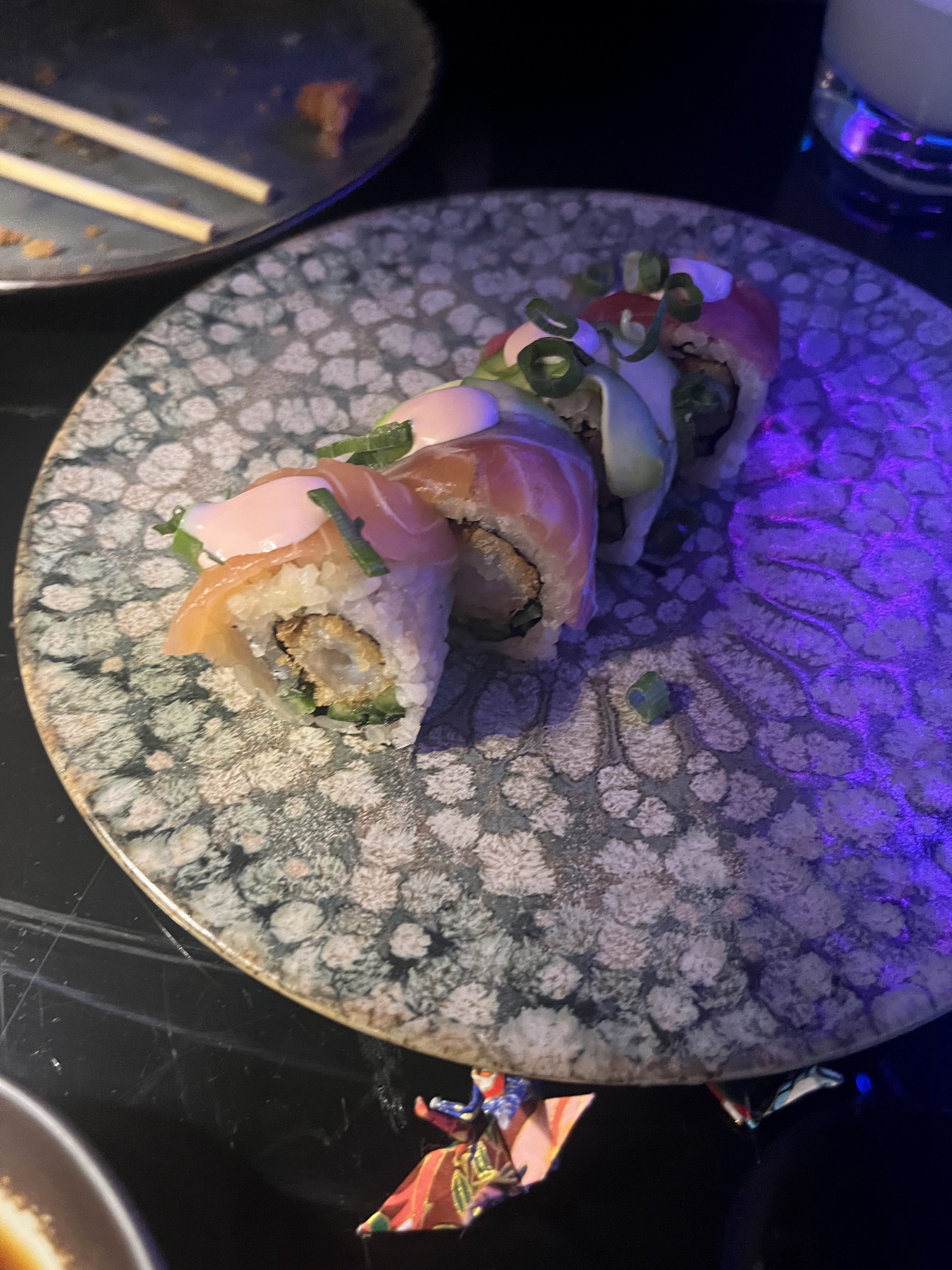 Procéder avec prudence. Notre soirée ici n'a pas répondu à nos attentes. Le service était nettement inférieur et décourageant. Les serveurs semblaient remettre en question notre décision de s'abstenir de consommer de l'alcool, ce qui semblait influencer le retard de notre service de restauration. Ils ont justifié cela en expliquant que leur établissement est une expérience gastronomique et non une restauration rapide, donc la préparation des sushis prendrait une heure. De plus, ils ont laissé entendre que notre choix d’eau comme boisson aurait pu avoir un impact sur la rapidité du service. Nous avons perçu un apparent mépris et un manque de compréhension à notre égard de la part de notre serveur, avec des soupçons de stéréotypes. Leurs rires à nos dépens et leurs critiques sur notre interprétation de leur conception européenne étaient déconcertants. Ce fut une véritable expérience qui nous a laissé incrédules. Notre dîner a commencé à 20h30 et notre plat initial est arrivé vers 21h18. Lorsque nous avons essayé d'annuler un plat ultérieur en raison de l'attente prolongée, notre demande a été initialement refusée. Sur une note positive, la qualité des sushis était excellente, malheureusement éclipsée par le service décevant que nous avons rencontré.