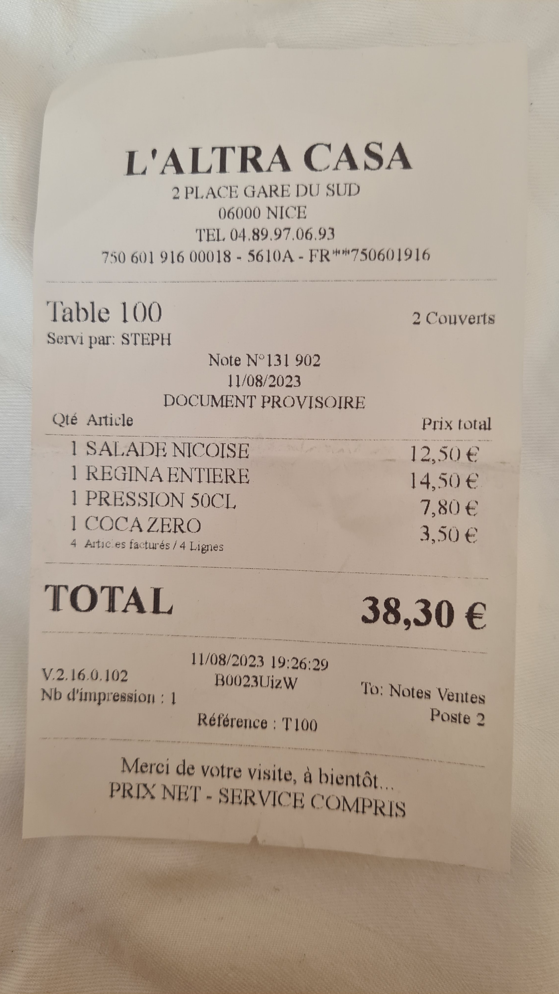 J'envoie ma fille régler par carte l'addition de 17,8 euros, elle revient sans ticket et 2 jour plus tard je m'aperçois que le serveur a taper 22 euros sur tpe. Voilà comment ça se passe à laltra casa...