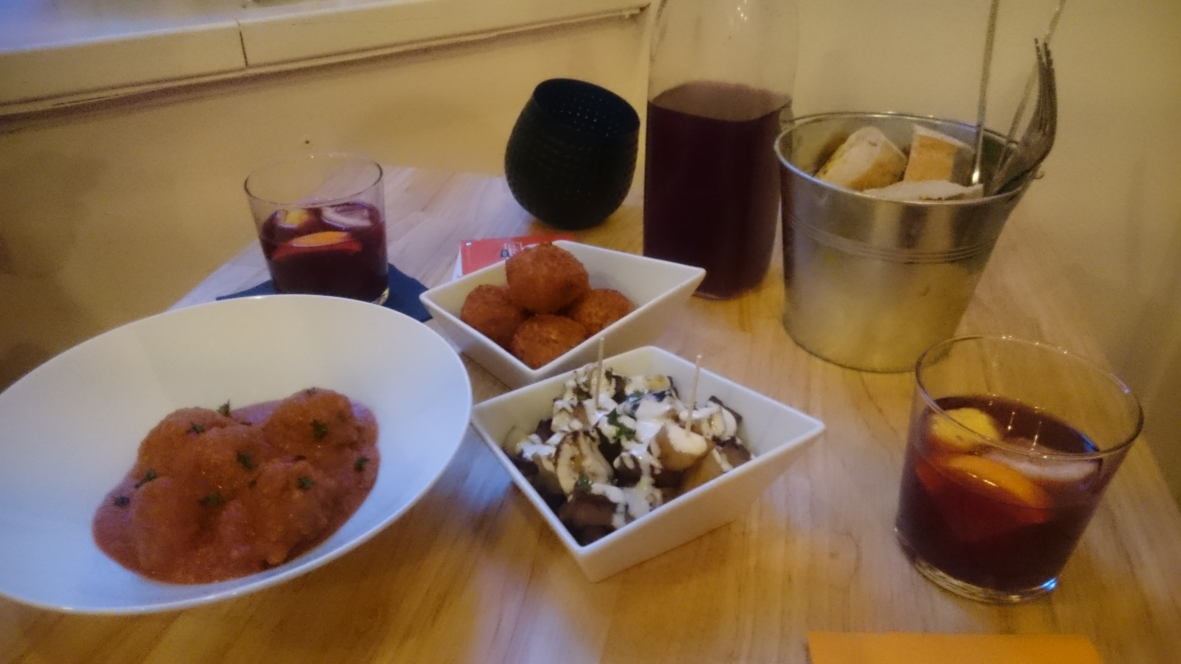 Nous avons été déçues des plats. Les croquetas aux épinards étaient fades et pâteuses, sans aucun goût. Les tacos au poulet étaient secs et sans surprise. Les patatas bravas étaient molles et servies avec une sauce tomate industrielle. Seules les crevettes étaient bonnes, assaisonnées et relevées. Pour couronner le tout, nous avons eu droit tout au long du repas à une playlist pop industrielle, elle aussi. Bref, si vous cherchez une ambiance et de la nourriture à l’espagnole, passez votre chemin.