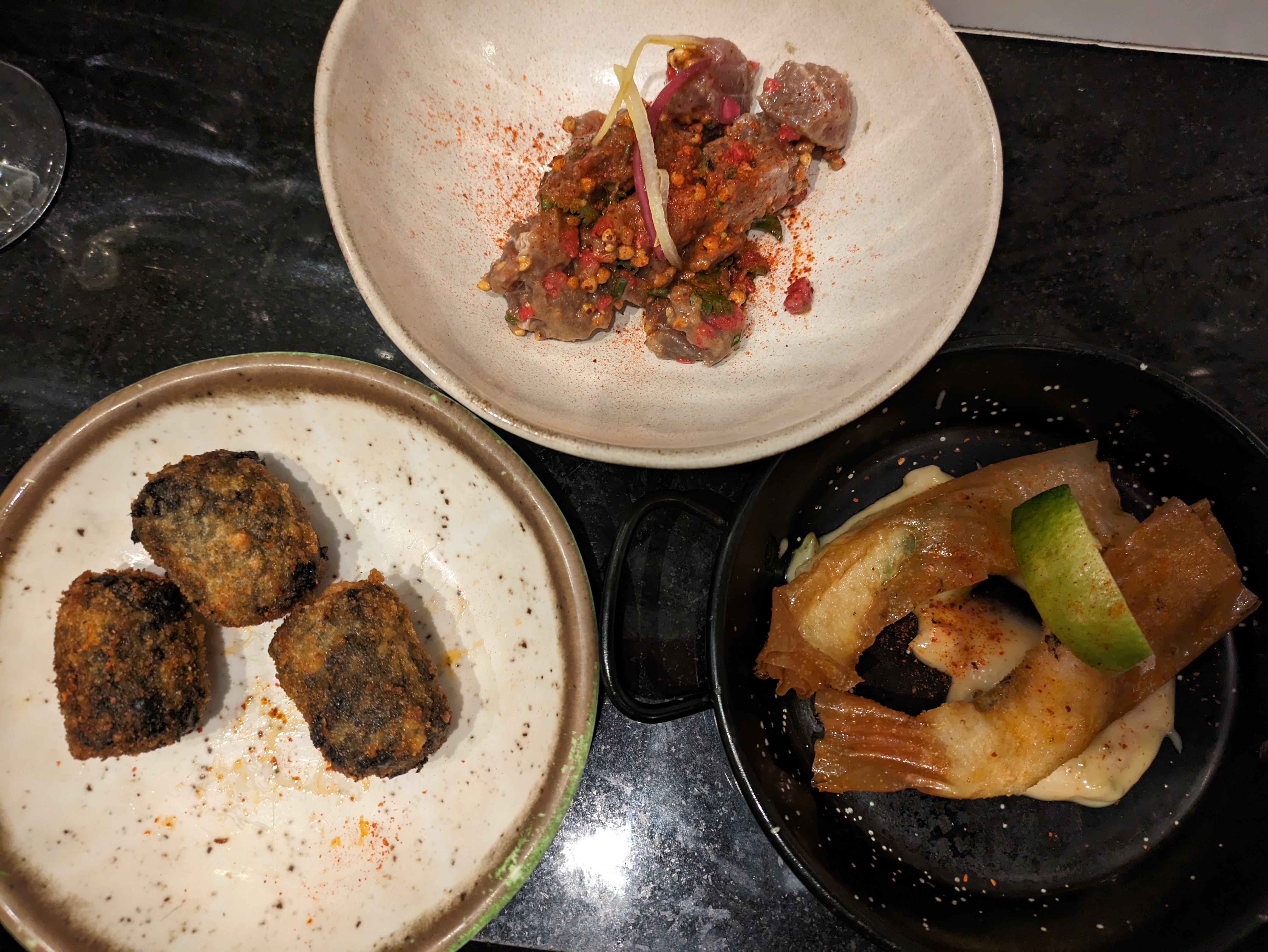 J'ai adoré la nourriture ici. Ce n'est pas votre restaurant de tapas moyen. Sièges au comptoir avec une partie du menu suspendue à des pancartes au plafond. Les carreaux des murs ont été décorés par les convives. Des huîtres sont également proposées et sont visibles sur la devanture de l'espace face à la rue.