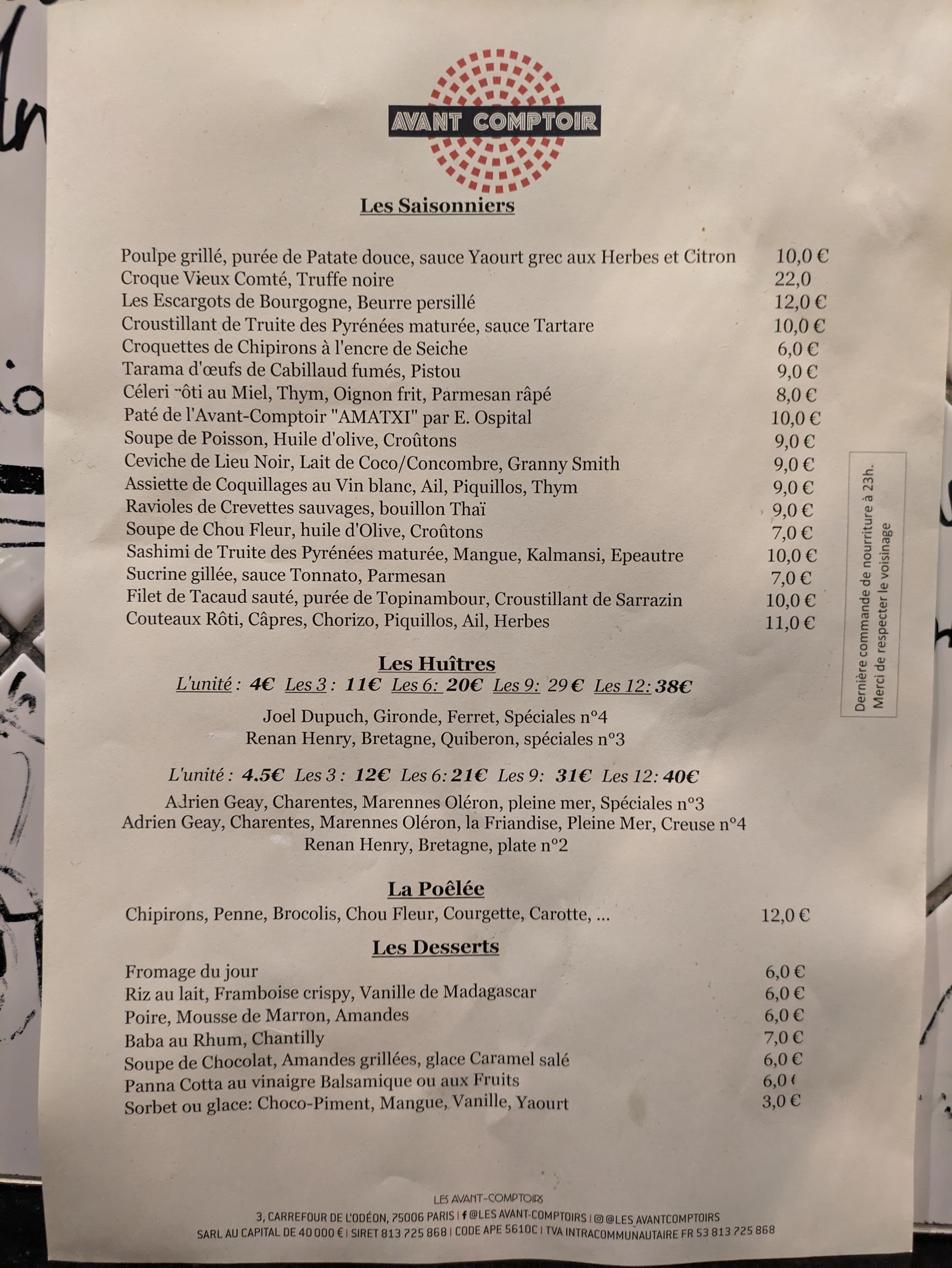 Nous avons été à l’avant comptoir vendredi soir avec une amie. Soirée sympa même si le service un peu lent et les prix sont complètement abusés, 40€ les 12 huîtres. Et ce sont ces fameuses huîtres qui nous ont rendu malade le soir même jusqu à aujourd’hui (mardi). Il va falloir surveiller l’hygiène de cet endroit car d’après les avis ça arrive de temps en temps