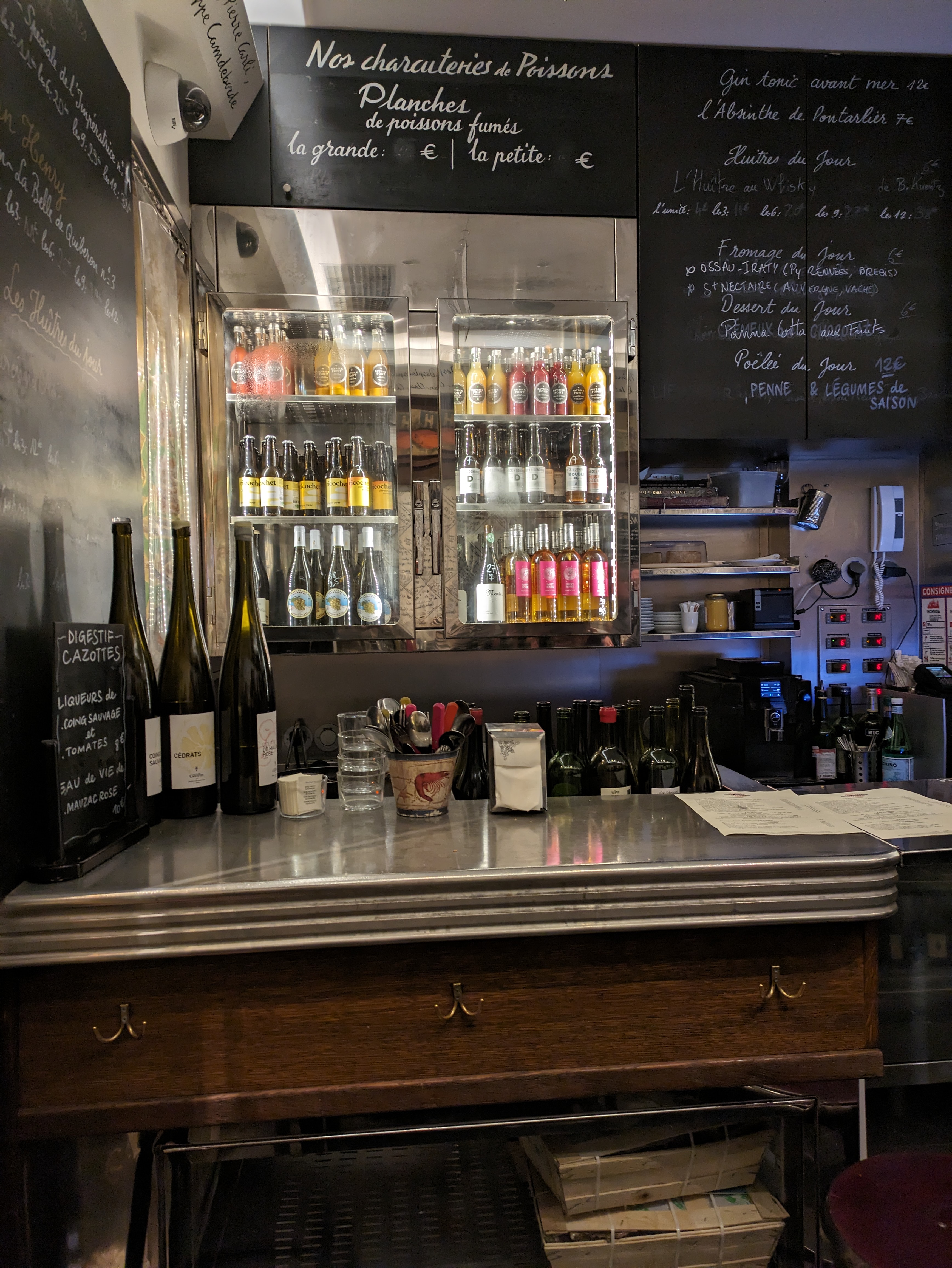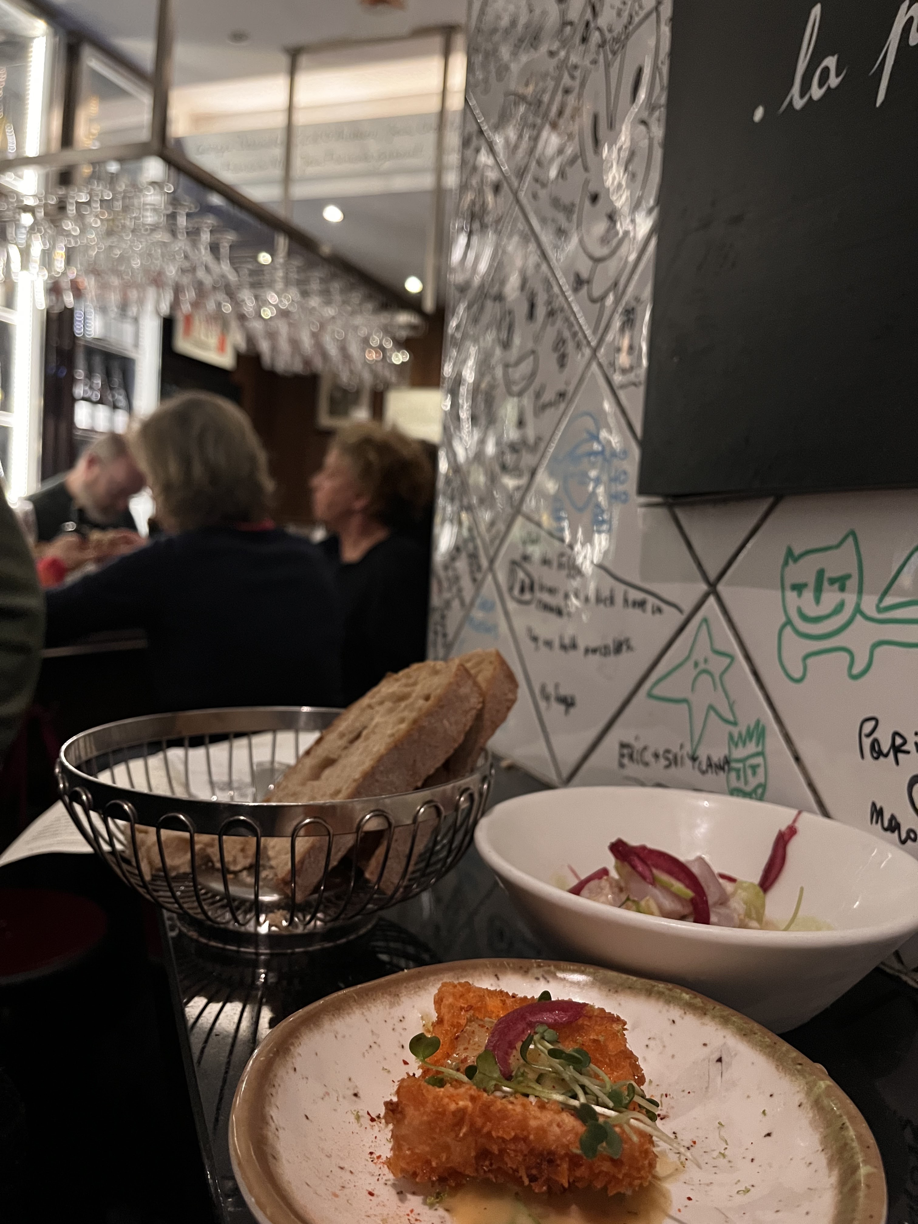 Endroit délicieux et charmant. Vous vous asseyez dans un bar et commandez des petits plats. J'ai eu les langostines grillées, la soupe de céleri et de châtaignes et les croquettes morue. Et un verre de vin délicieux ! Il me reste encore quelques jours à Paris et j'y retournerai peut-être !