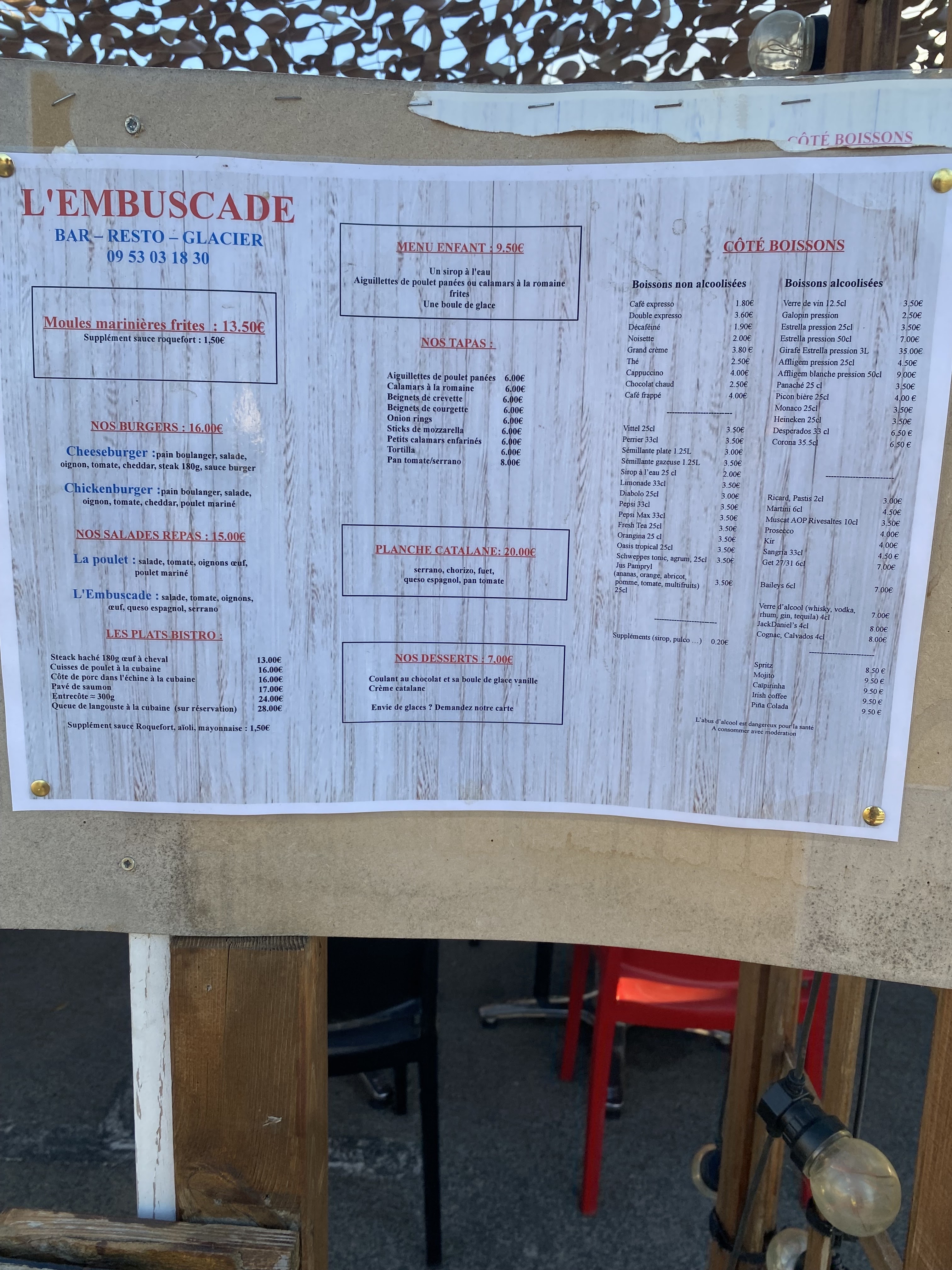 Nous avons mangé en famille à l'Embuscade où nous avons été très bien reçu et servi par une jeune serveuse très agréable, tout comme le jeune homme qui nous a encaissé ,les plats étaient bons( fish burger,steak de thon, beignets de calamars),Les desserts aussi ( glaces et tarte catalane).Rapport qualité-prix imbattable !!je vous recommande vivement l'Embuscade si vous êtes de passage a toreilles plage!!!