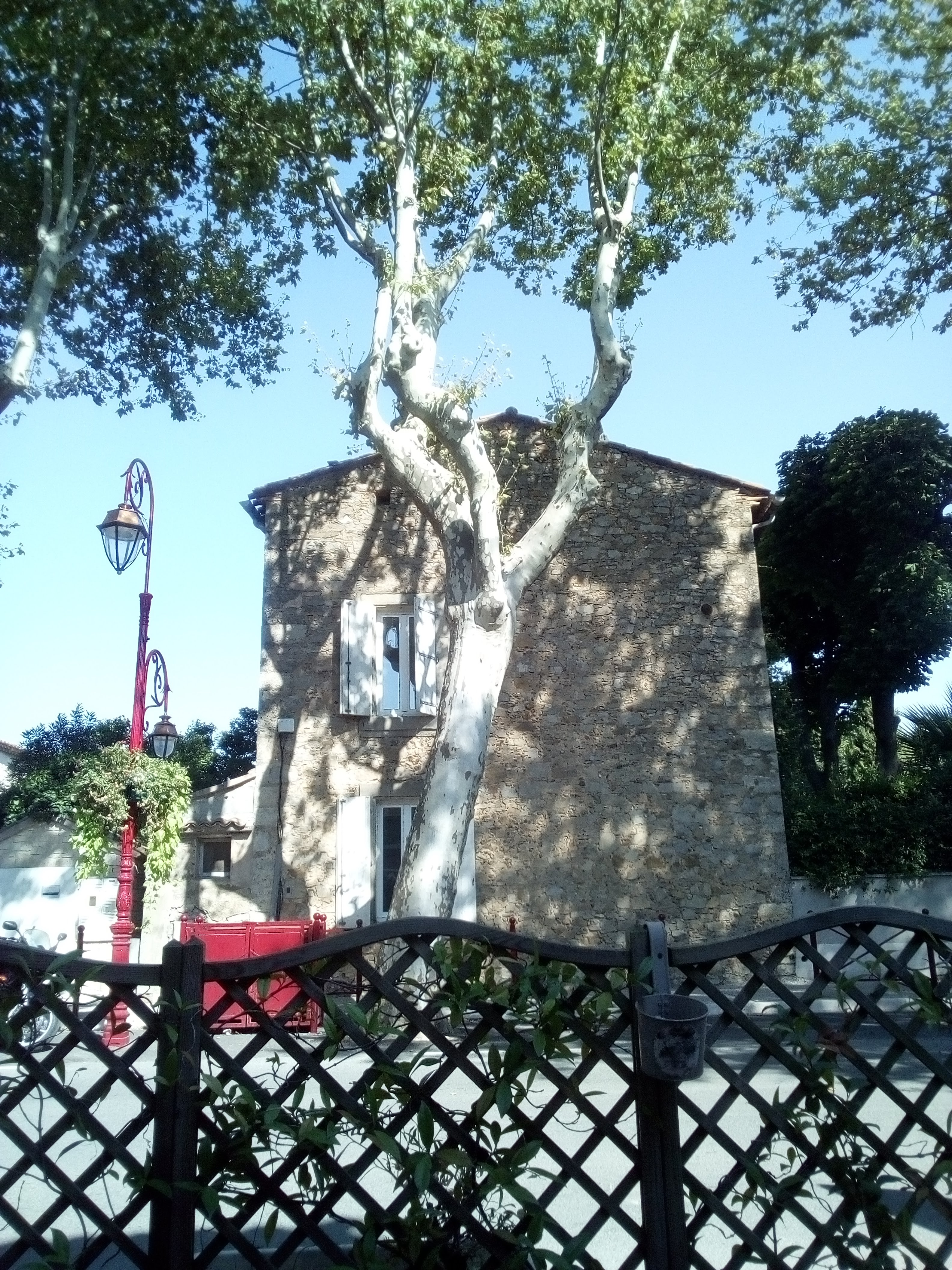 Petit café de village avec sa terrasse ombragée sous les platanes qui bordent les rues