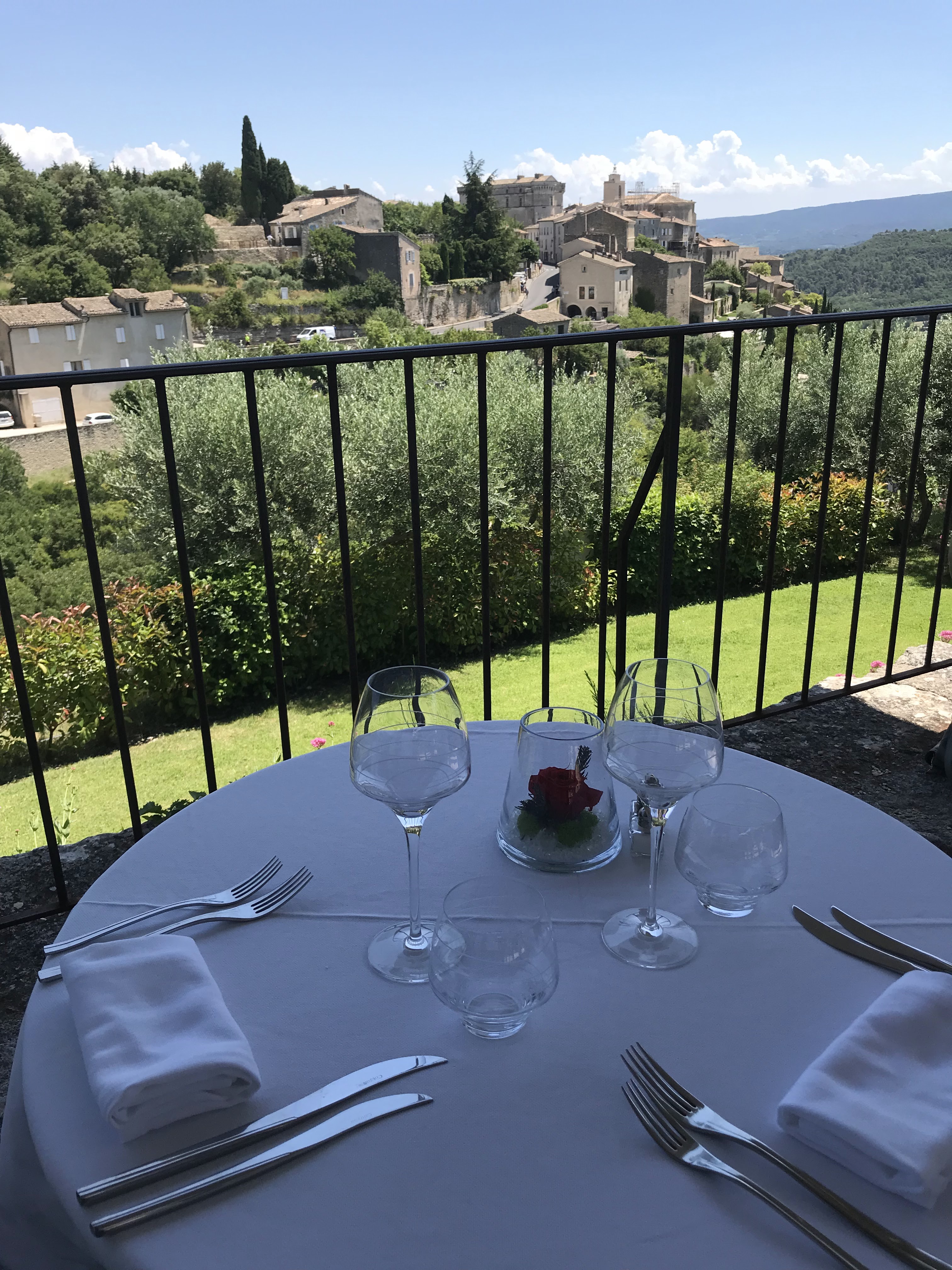 Délicieux dîner, bien présenté, grande sélection de vins au verre et vue fantastique sur Gordes.