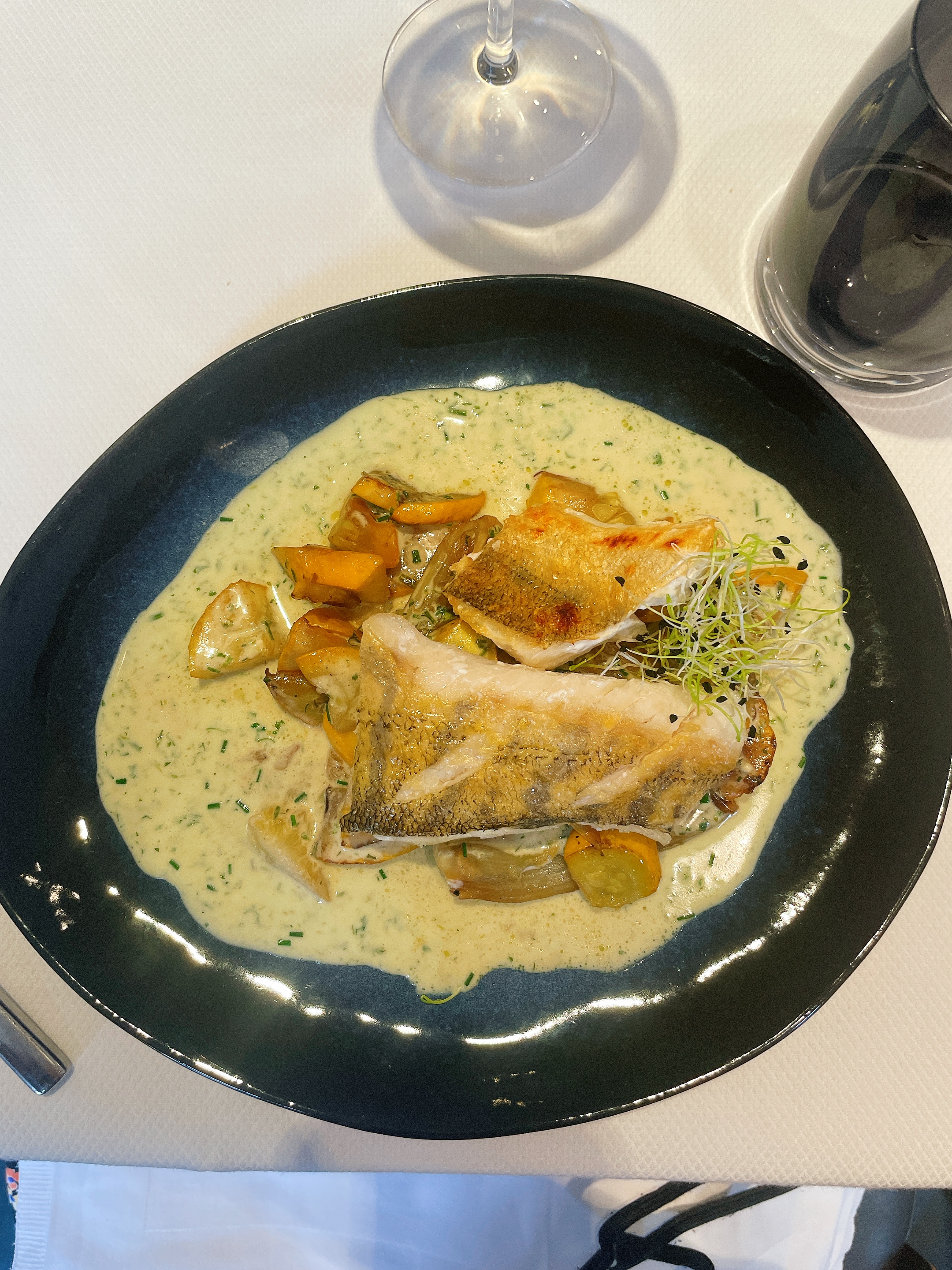 J'ai visité ce restaurant pendant mes vacances. Nous avons choisi l'intérieur. À première vue, cela semblait un peu froid et stérile. Le service était au départ très attentionné et sympathique. Les plats et la présentation étaient innovants et nous les avons beaucoup aimés. Il y avait de très bons vins. Au cours de la soirée, nous avons eu le sentiment que la serveuse se déplaçait presque uniquement à l'extérieur et s'occupait des invités. A l'intérieur, nous n'avions que deux tables occupées. Nous avons dû attirer l'attention sur nous à 3 reprises. Dans l'ensemble, c'était une excellente soirée, tout était très bon et nous y retournerions volontiers