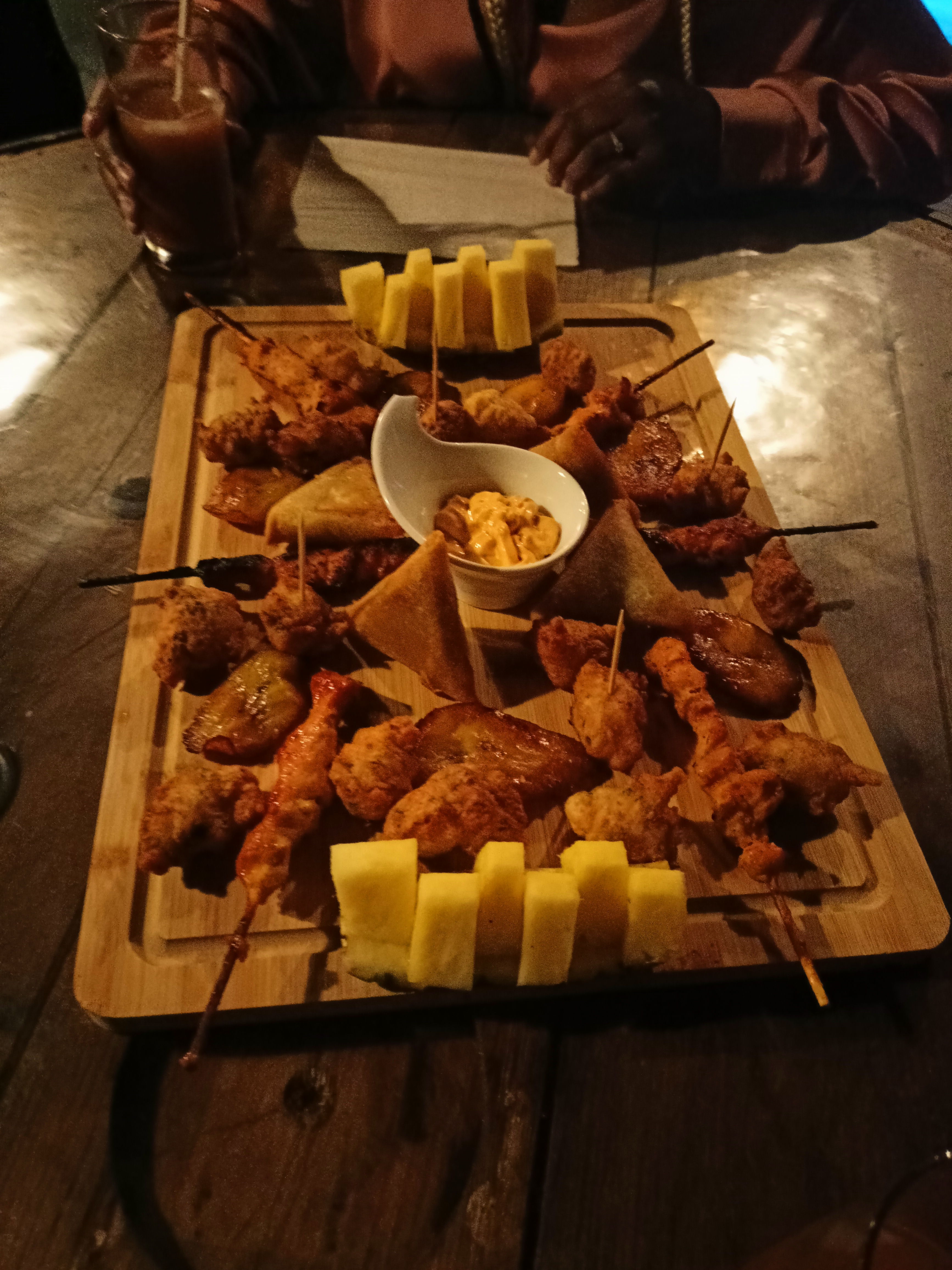Nous avons partagé une planche bien garnie avec brochettes de poulet caramélisé, accras et un rhum arrangé délicieux! C'était parfait. Dommage que vous soyez si peu visibles et éloignés du centre!