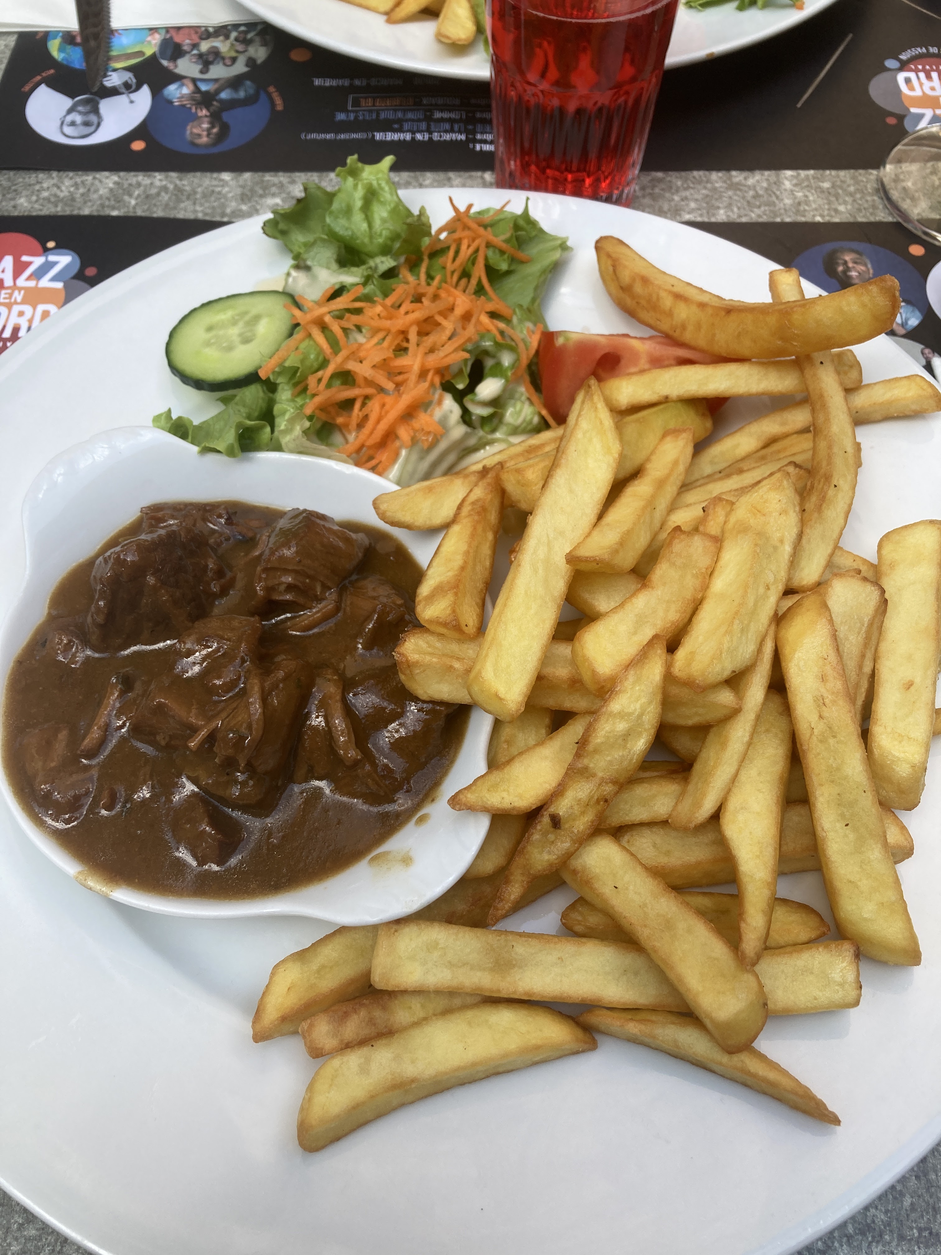 Je suis allé m'y restaurer le samedi midi de la braderie de Lille. A notre arrivée, la barmaid nous informe que ce sera moules frites et rien d'autre. Ok pour nous. On s'installe sur la terrasse, au fond de la salle intérieure. On a un choix plus important de quatre plats pour déjeuner avec notre nouvelle interlocutrice!. Du coup, on prend majoritairement des moules, pour faciliter le service et parce qu'à la braderie, on mange ce plat traditionnel. Surprise, les moules sont bonnes, bien servies avec une super sauce au Maroille. Quant aux frites, une toute petite portion !. Franchement, trop déçu de la quantité de frites que j'avais dans ma barquette. Bien évidemment, j'ai tout mangé et, je suis allé en acheter une autre en sortant, car les frites dans le nord, ça doit rimer avec quantité. Dommage, mais avec une telle erreur sur la quantité de frites pour ce plat, je ne peux pas mettre plus d'étoiles surtout que nous n'avons pas eu de serviettes pour manger ces moules !!!.