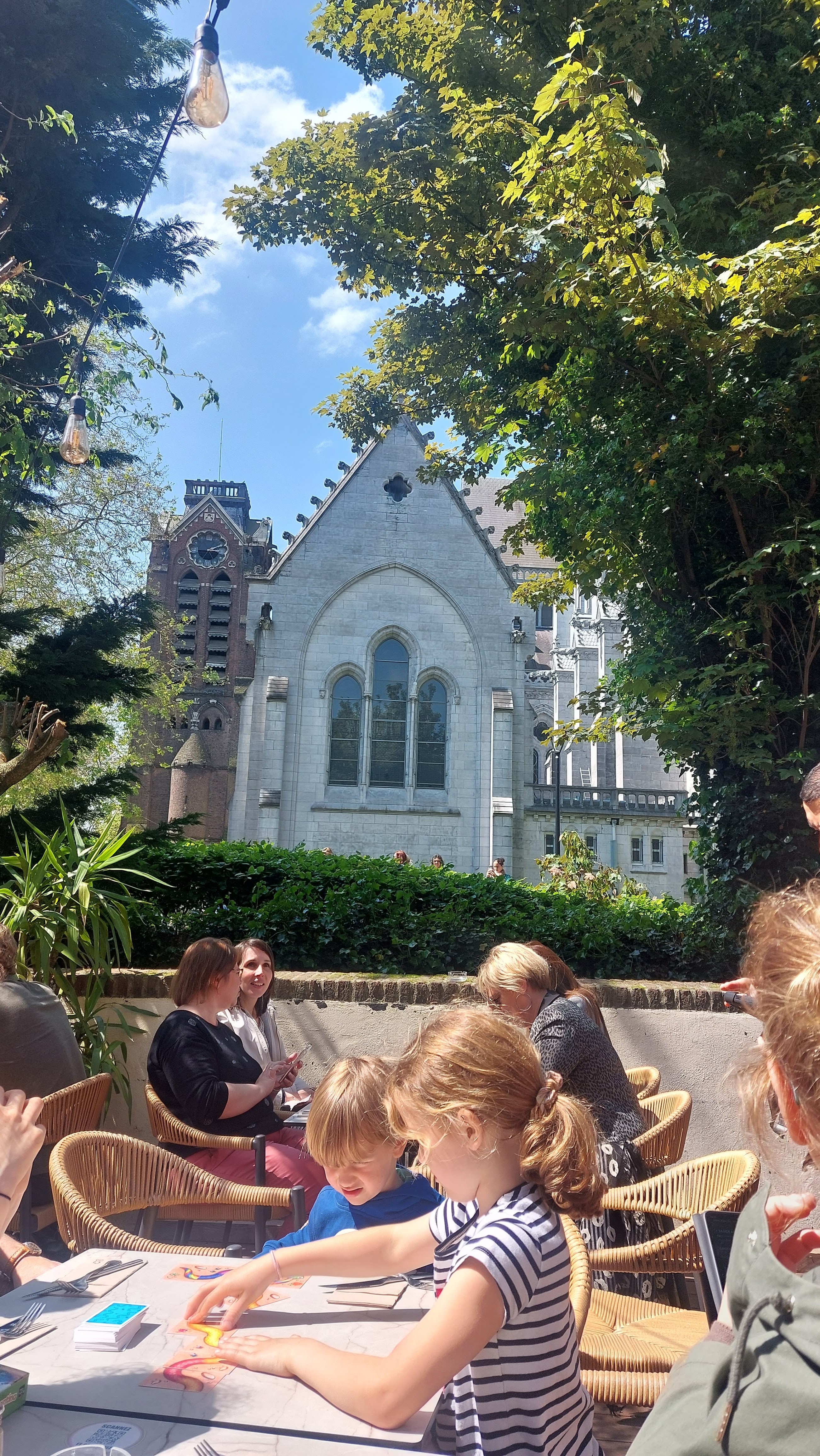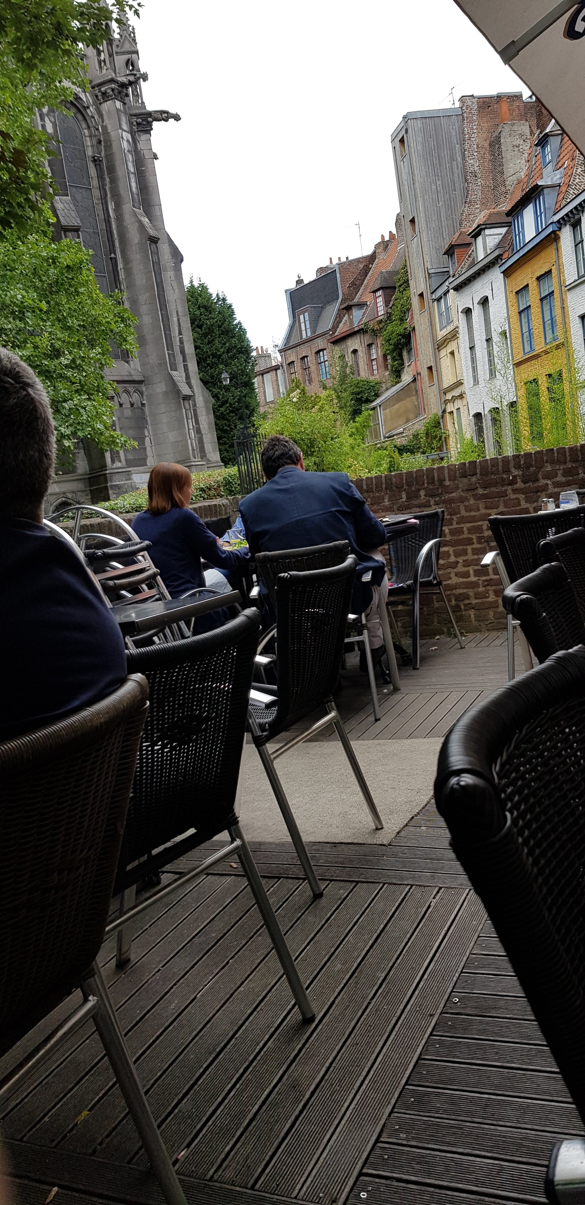 Terrasse très agréable au cœur du vieux Lille, derrière la cathédrale, au calme et à l'ombre des arbres.