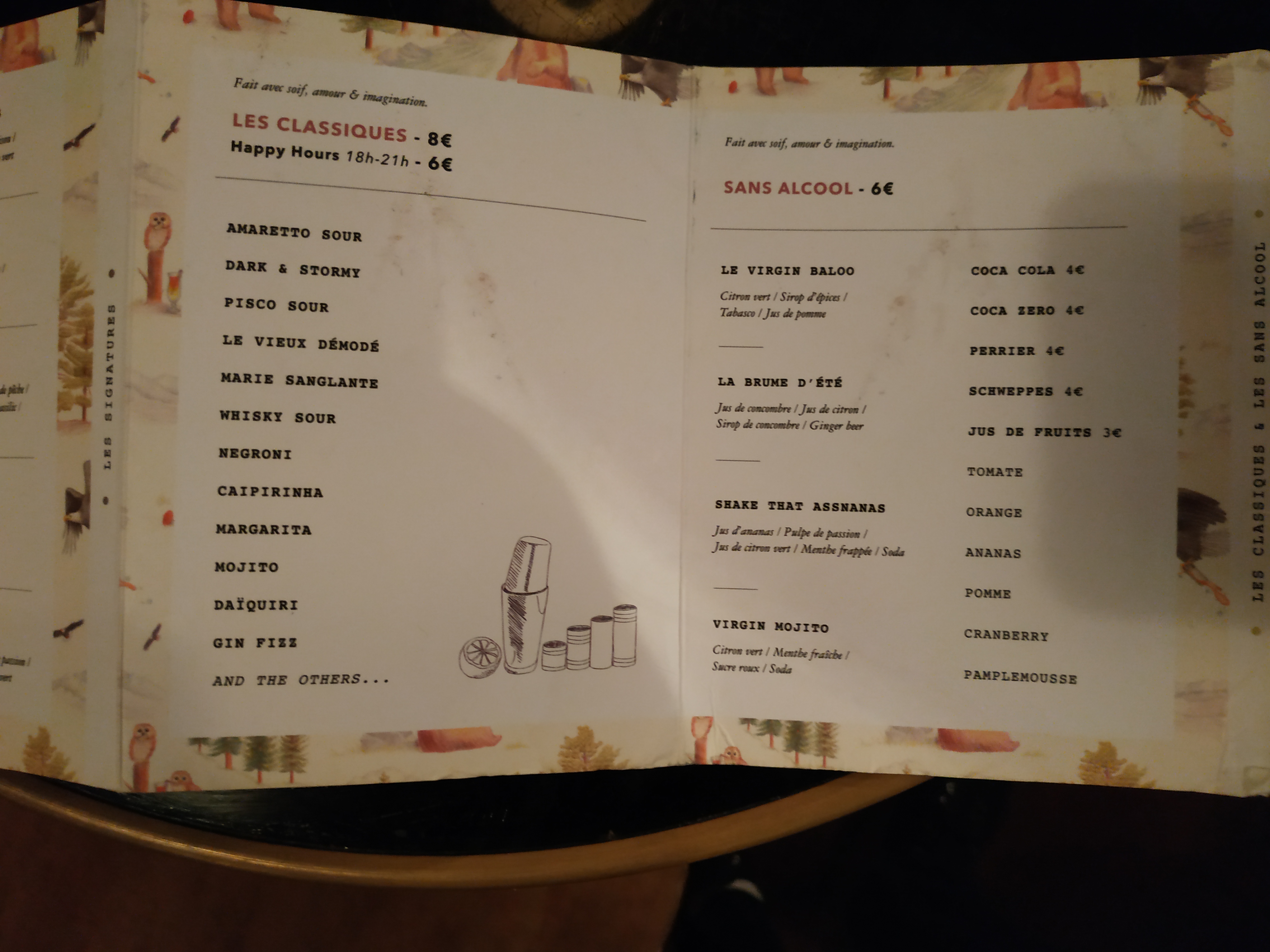 Une carte de cocktails qui se partage entre mélanges classiques (Mojito, etc) et originaux ( La petite ours). 6€ à l'happy hour et 8€ après, le rapport qualité/prix est imbattable ! Les serveurs sont très sympas et l'ambiance est décontractée. Clientèle étudiante.