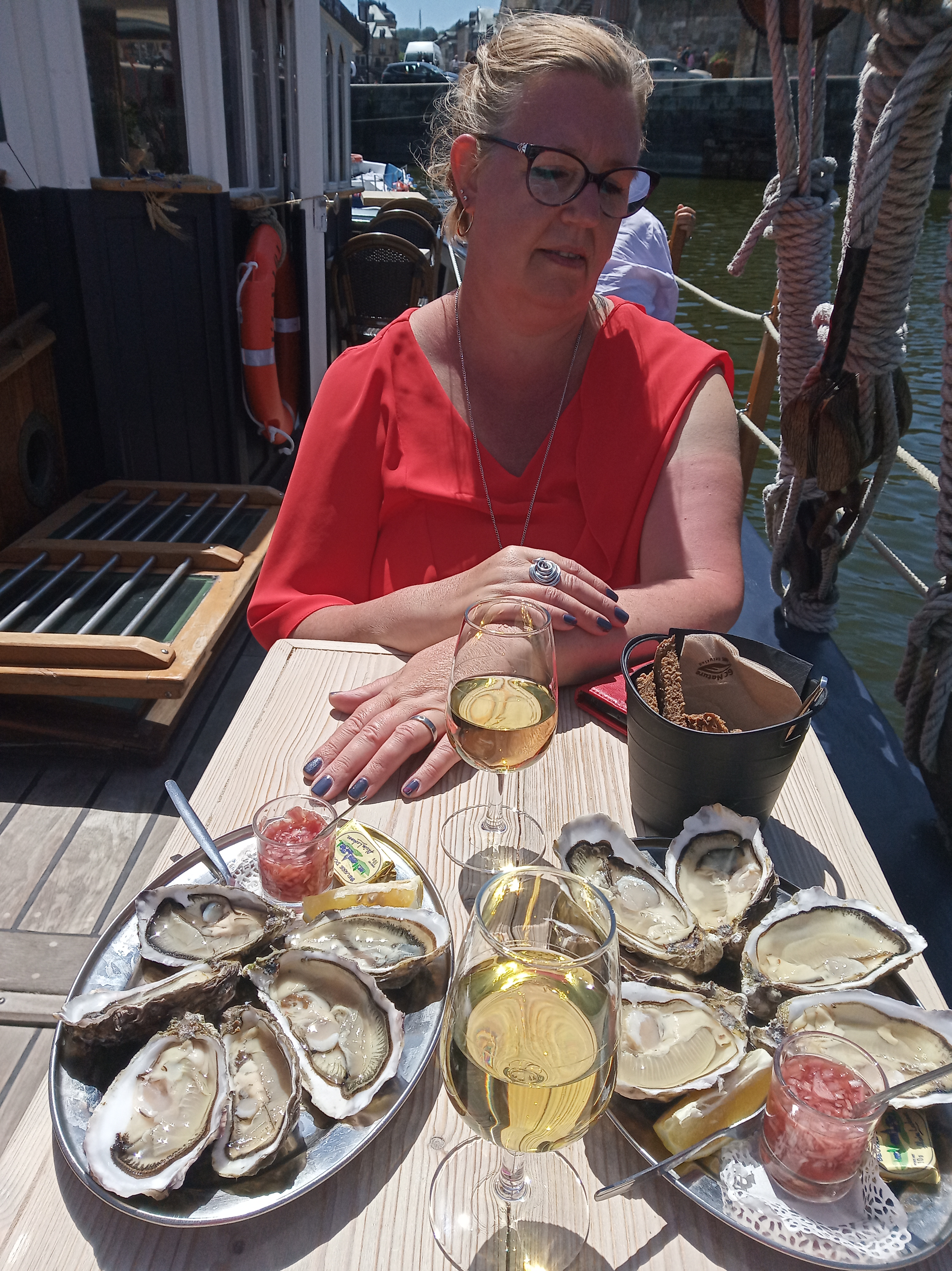 Huîtres et vin sur un bateau dans le port de Honfleur ! Simple mais merveilleux. Super recommandé!