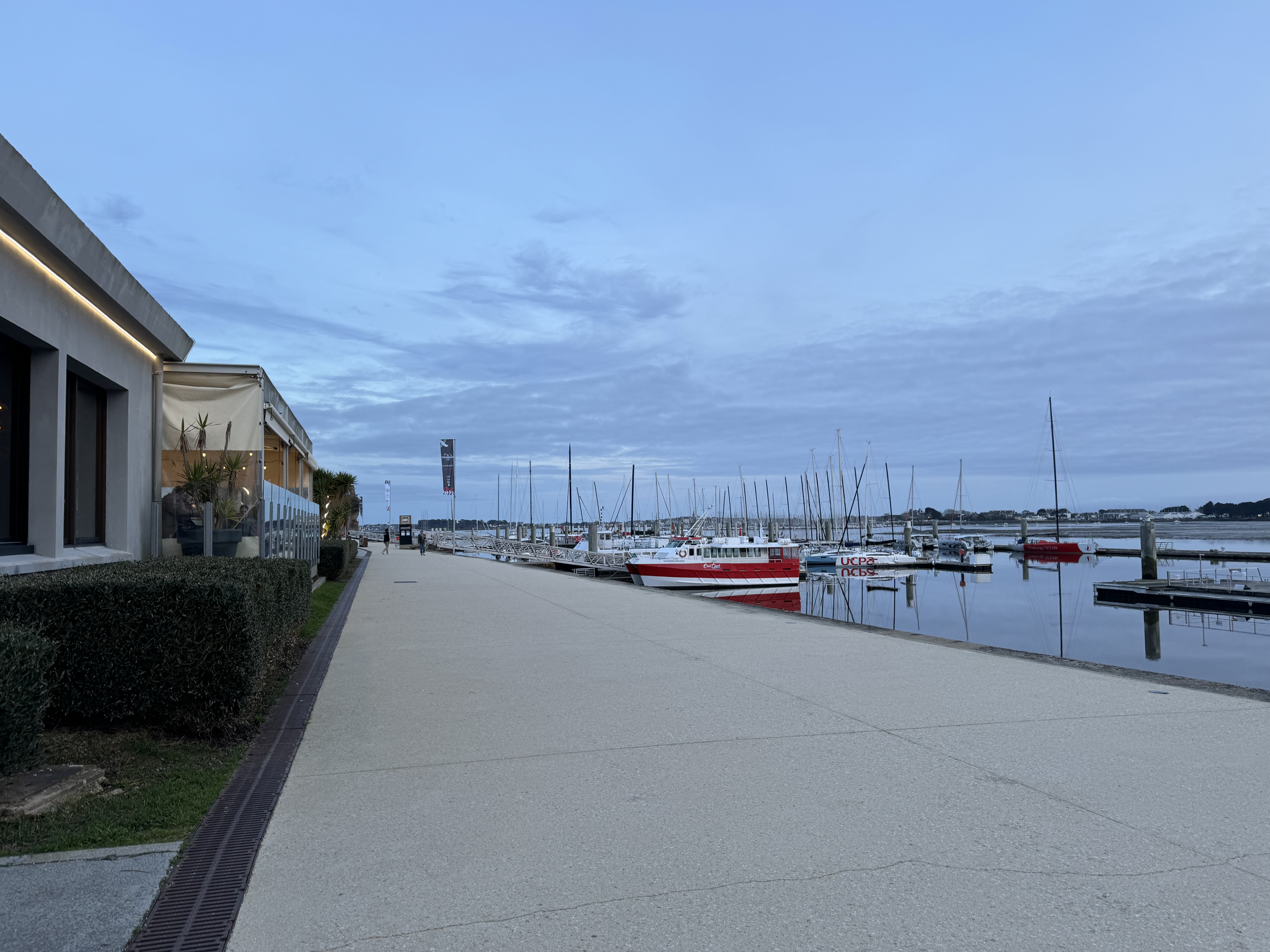 C est dommage la cadre est sympa. Mais on la paye le prix fort. De plus c est très impersonnel. Il n y a aucun service. On commande au bar. On attend les verres et on va s assoir. Je conseillerai la villa Margaret en face au kernevel. C est une bien meilleur adresse. De plus c est le rdv de la jetset lorient qui se montre