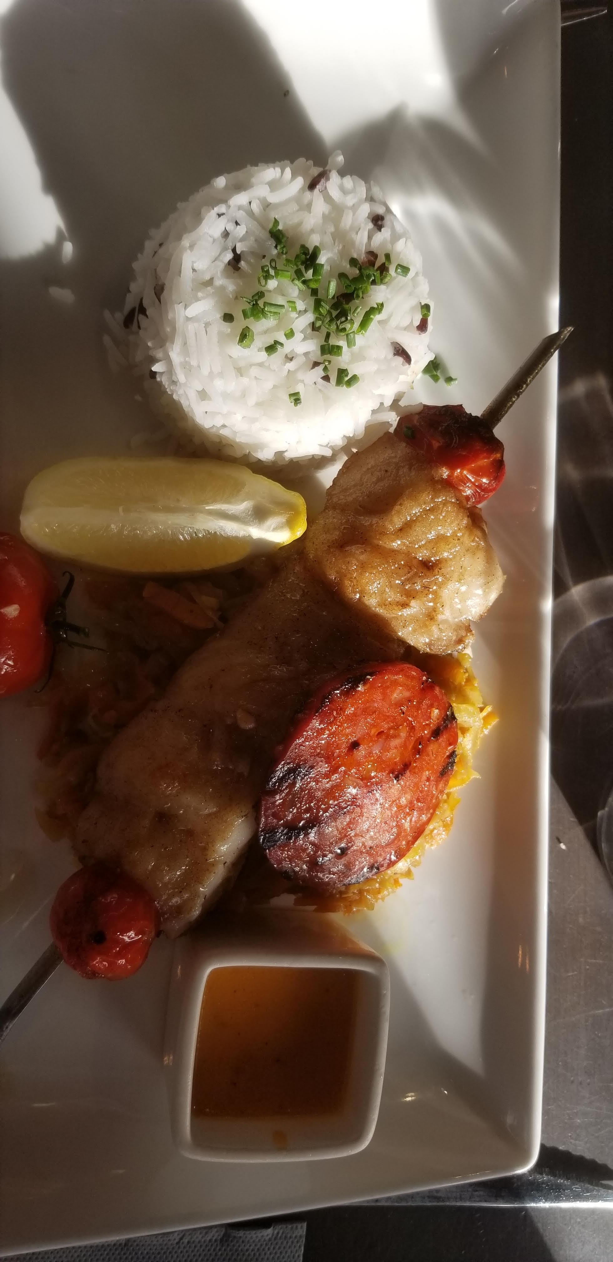 Cadre et ambiance agréables, brochettes de poissons très bien cuites et assaisonnées, accompagnements et sauces nickel, super mousse au chocolat maison. Équipe de service très efficace et agréable. Que demander de plus ? Bah rien c'est parfait !