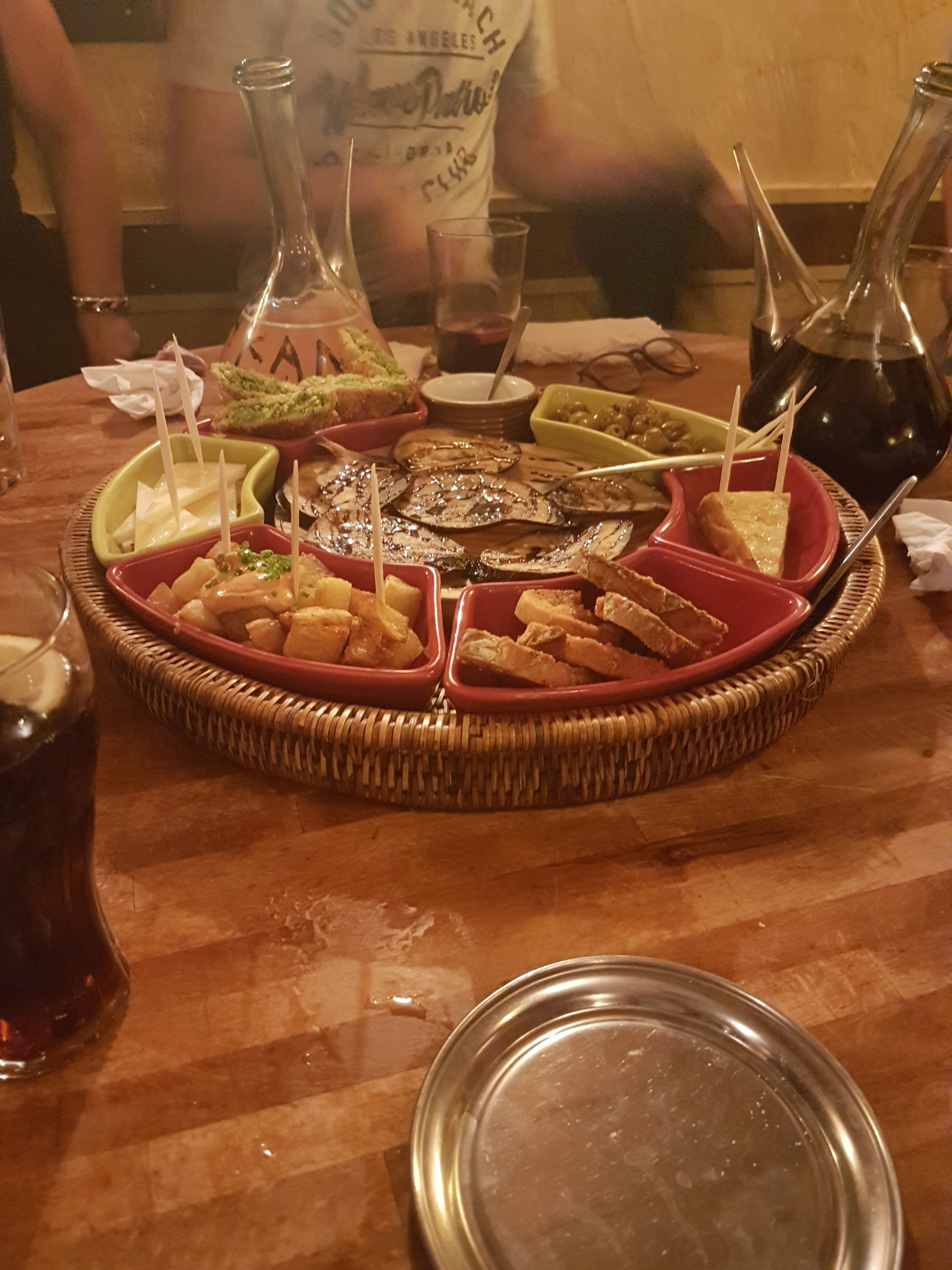 Les tapas sont généreux mais pas forcément de top qualité, l'ambiance est très festive et c'est souvent blindé. A essayer au moins une fois pour l'ambiance et les pourron à boire de façon spectaculaire :)