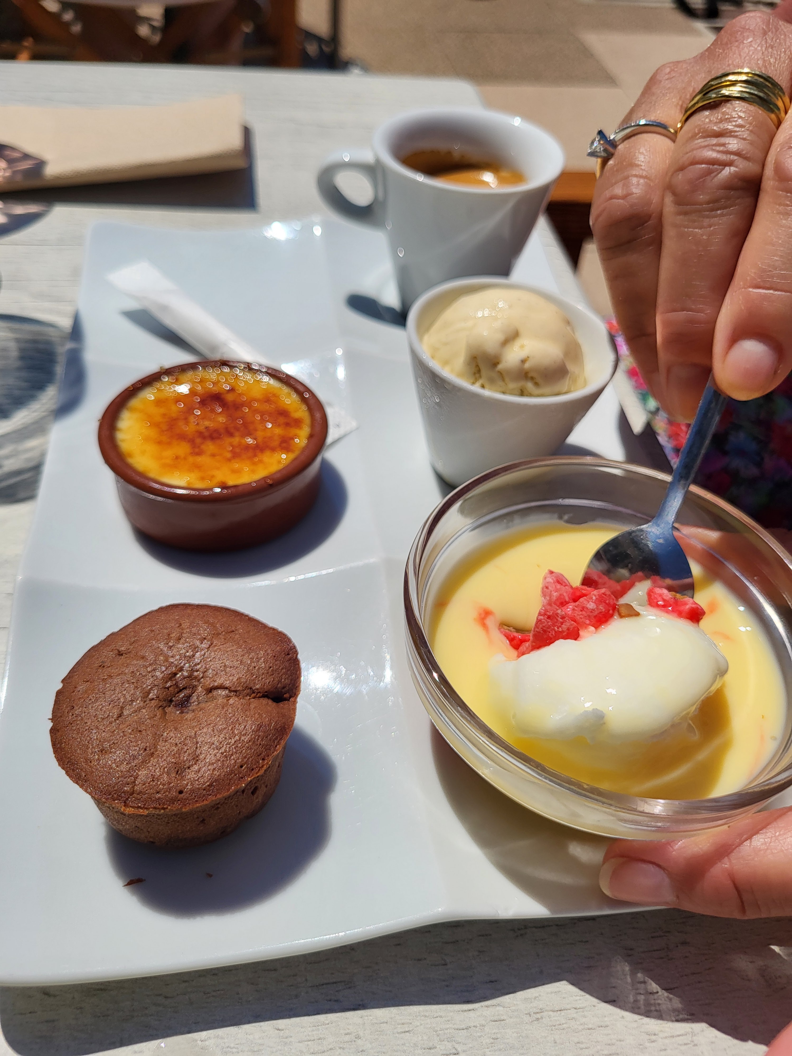 Serveuse vraiment très sympathique, agréable et souriante.Un peu déçue que la soupe de poissons ne soit pas disponible,je l'ai remplacé par une salade de chèvre chaud très bien servie.Les moules frites étaient très bonnes.Le geste du petit digestif offert est sympathique. Le cadre est magnifique, manger face aux bateaux est un plaisir pour les yeux.