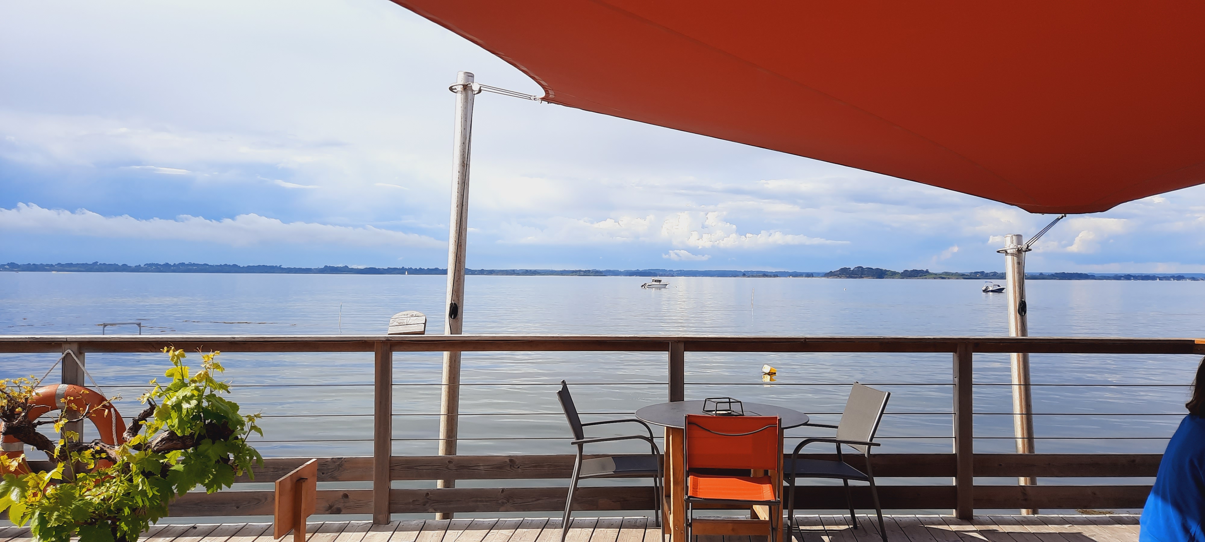 Une table avec une jolie vue sur le golfe du Morbihan pour déguster coquillages et crustacés.