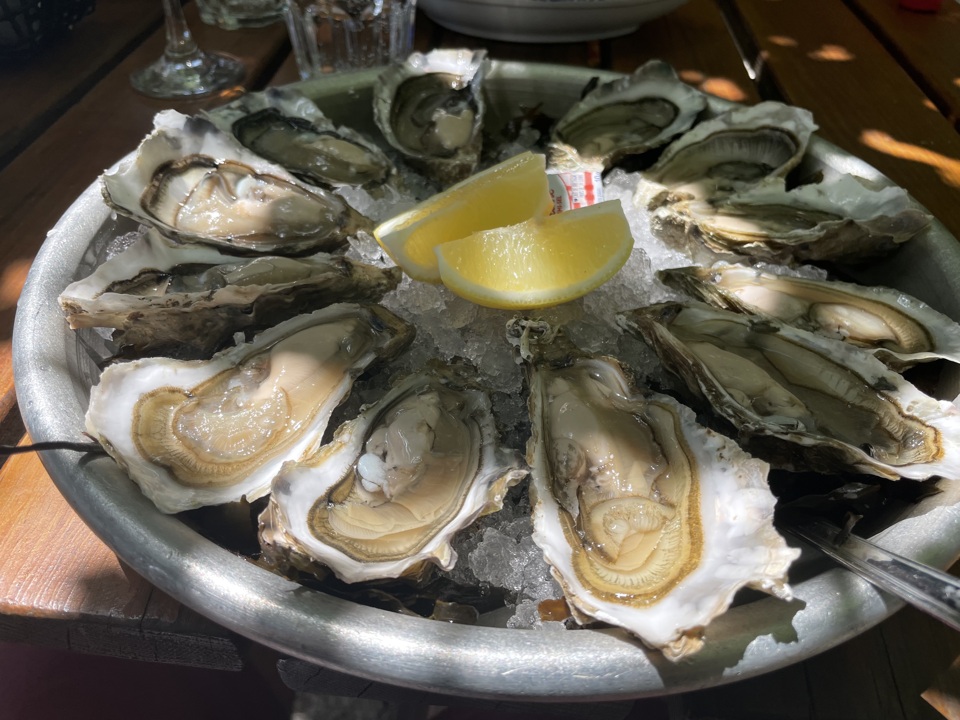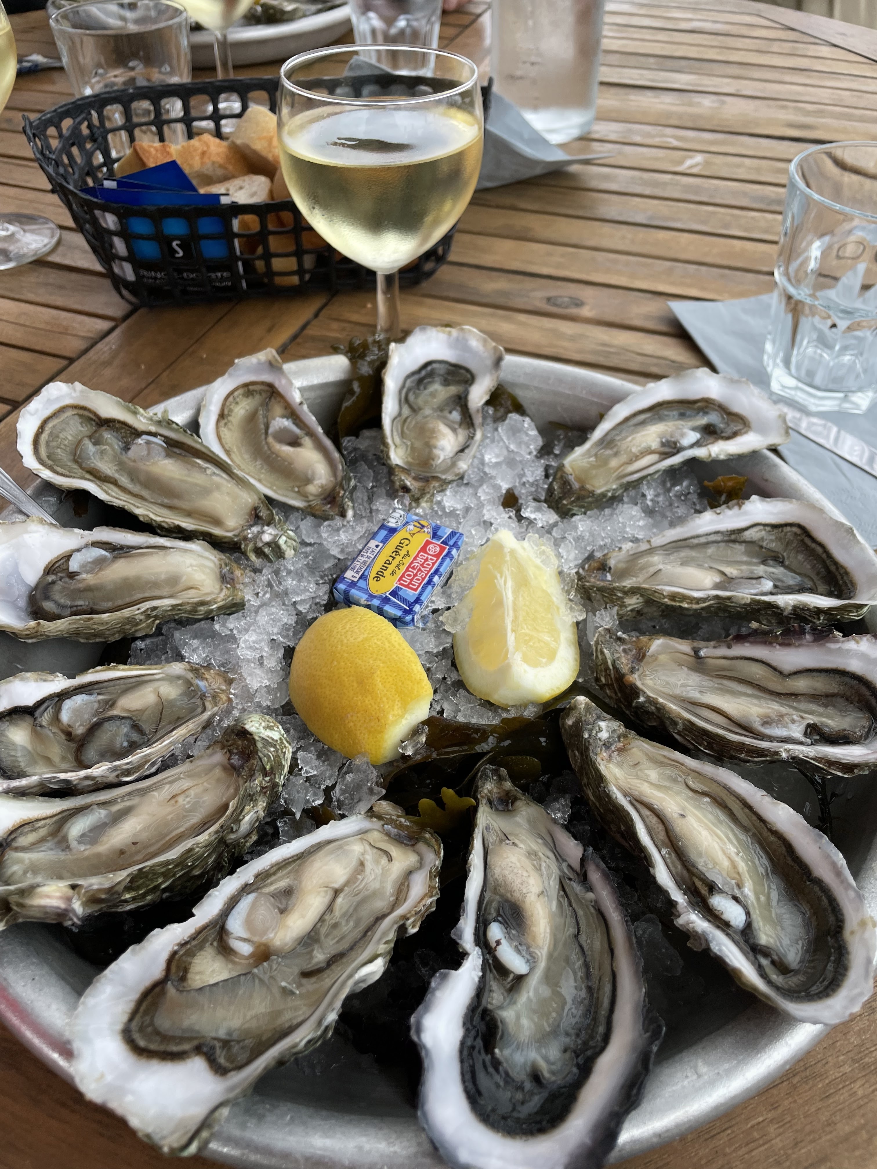 Évidemment la vue sur le bassin depuis la terrasse vaut le déplacement. Les huîtres sont grasses à cette époque. On aime ou pas. Pain, beurre, citron (juste assez), minuscule verre de vin blanc (équivalent paraît-il au ballon habituel). Le service pourrait être plus sympa.