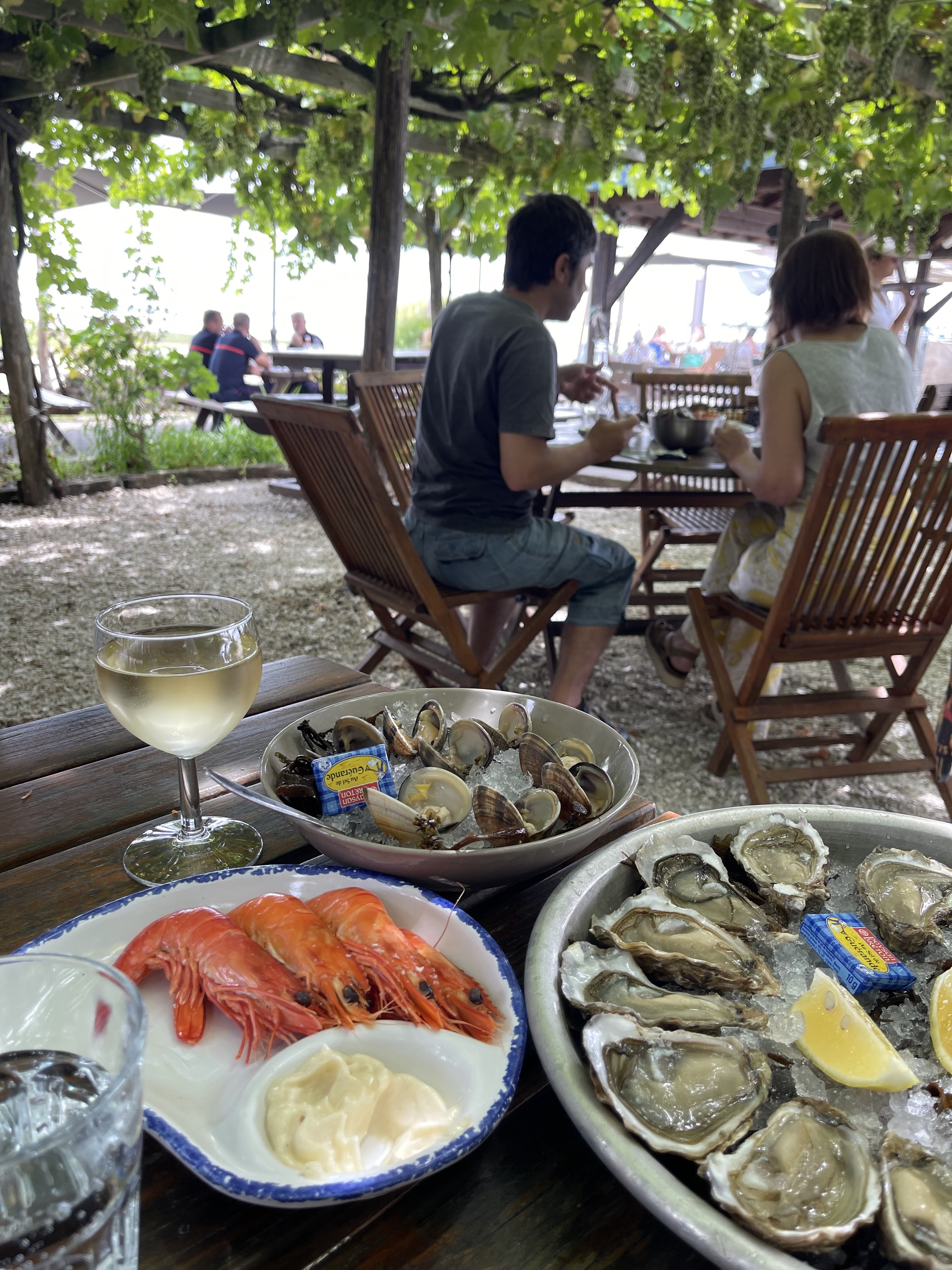Nous avons terminé notre séjour sur le bassin par une dégustation d'huitres et crevettes ,à l ombre des vignes et sur un joli tapis de coquillages. Nous recommandons vivement ce lieux ,qui a conquis les adultes comme les enfants..De plus ,l équipe est super 👌.