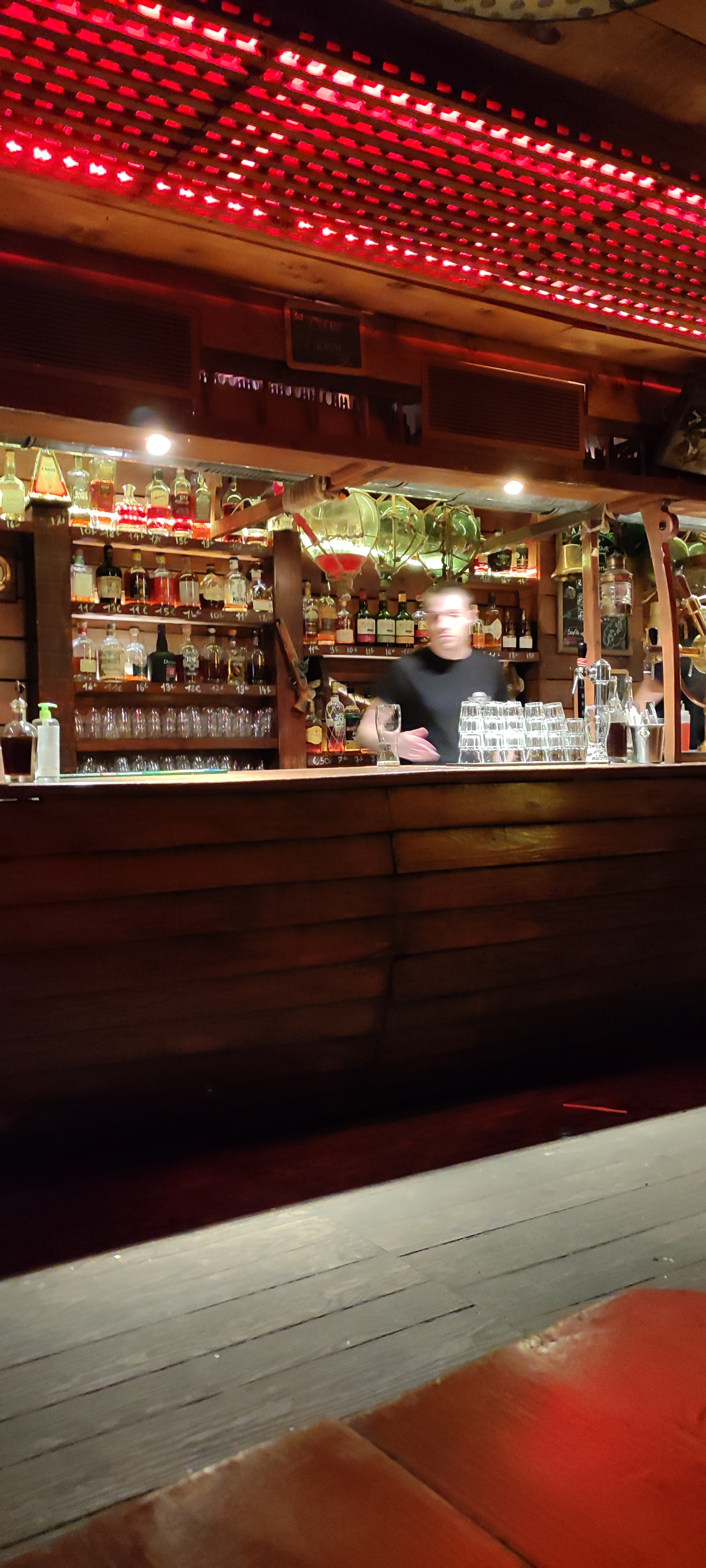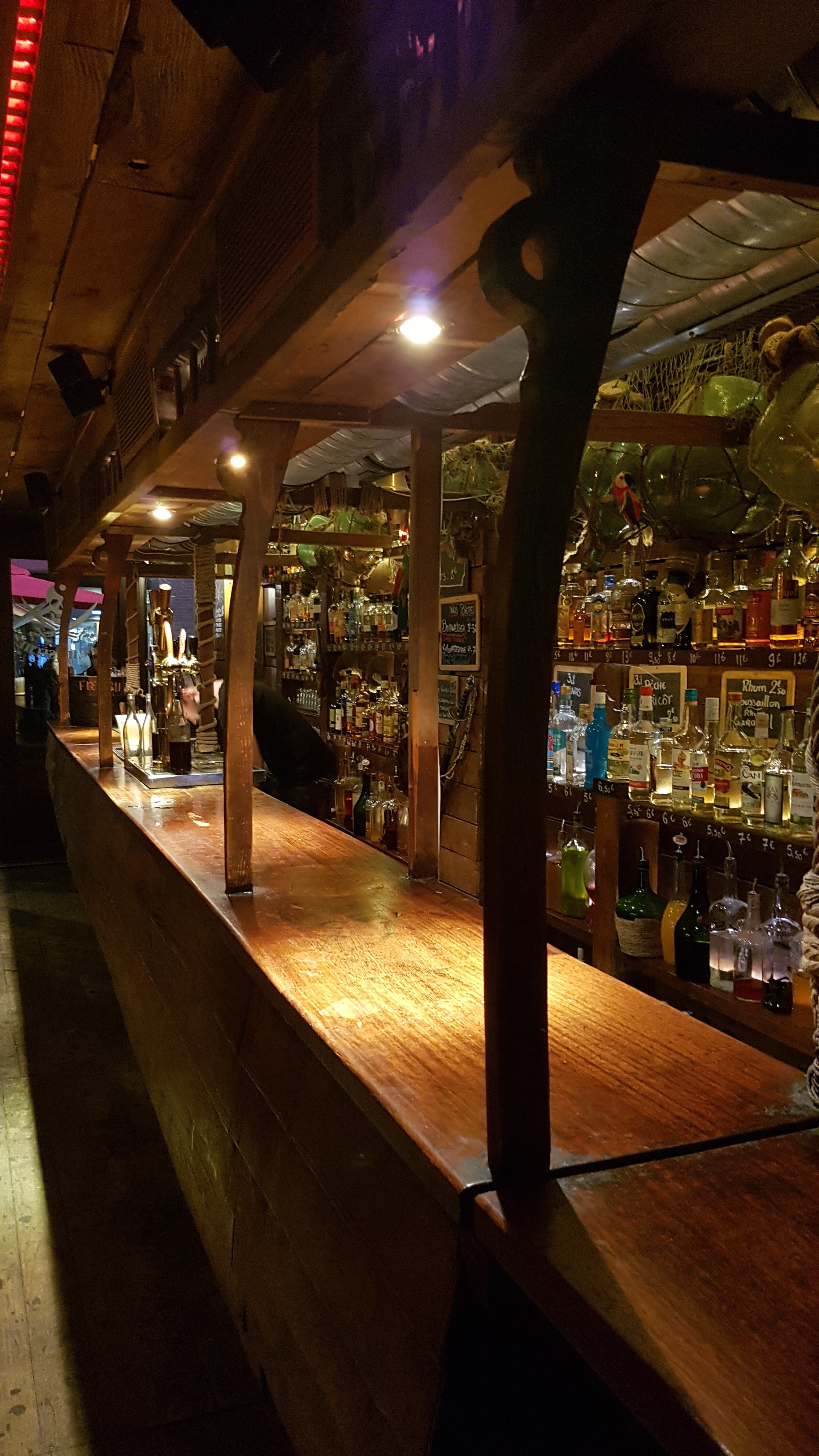 J aile ce bar car on y est serré, entouré de bois en forme de demis bateau. Je prend une bouteille de rhum arrangé, un petit shooter de crème de rhum et c est partit pour une bonne soirée