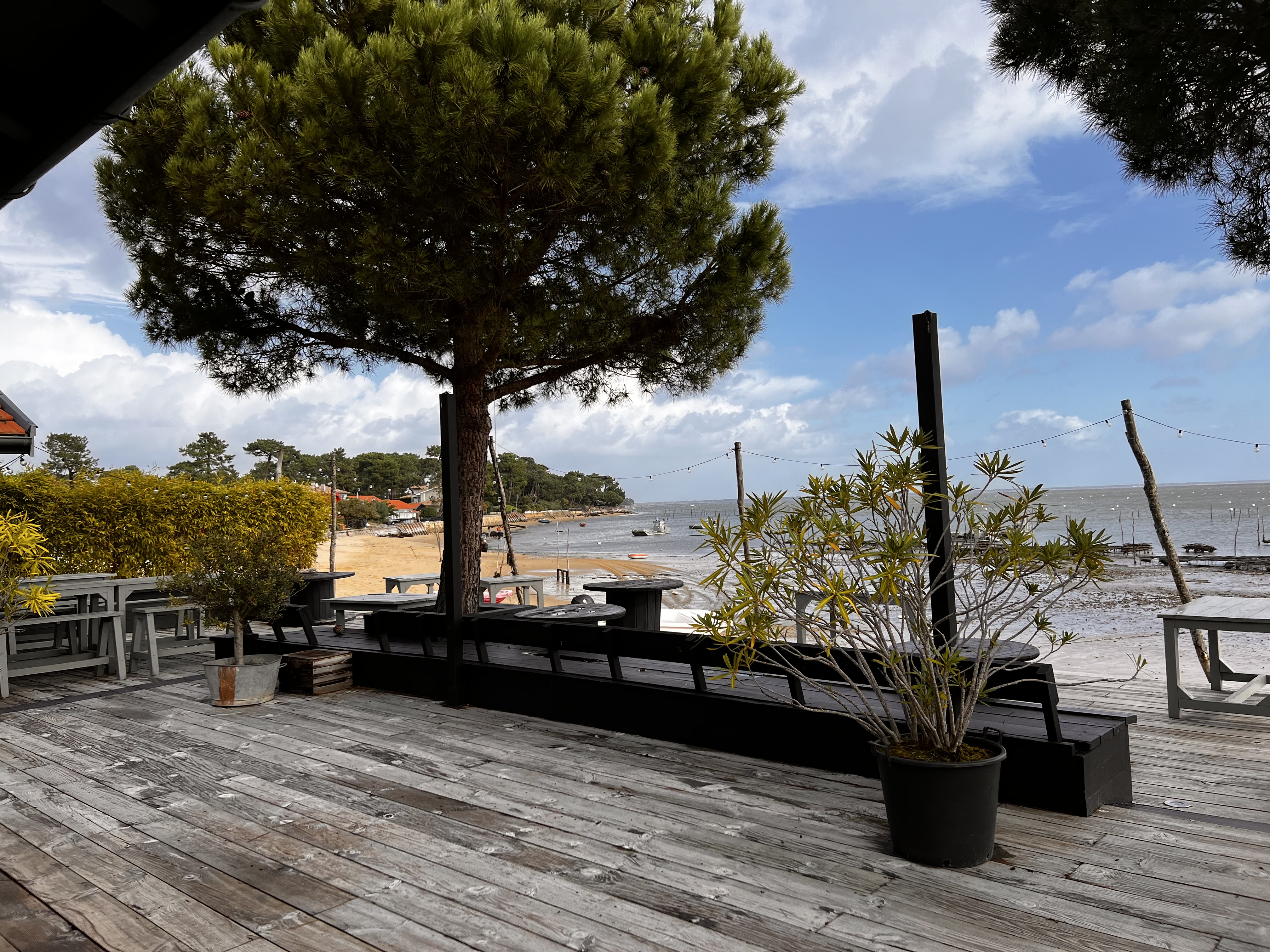 Terrasse très agréable sur la plage, huitres fabuleuses à déguster face au bassin. Service impeccable. Un endroit à fréquenter absolument.