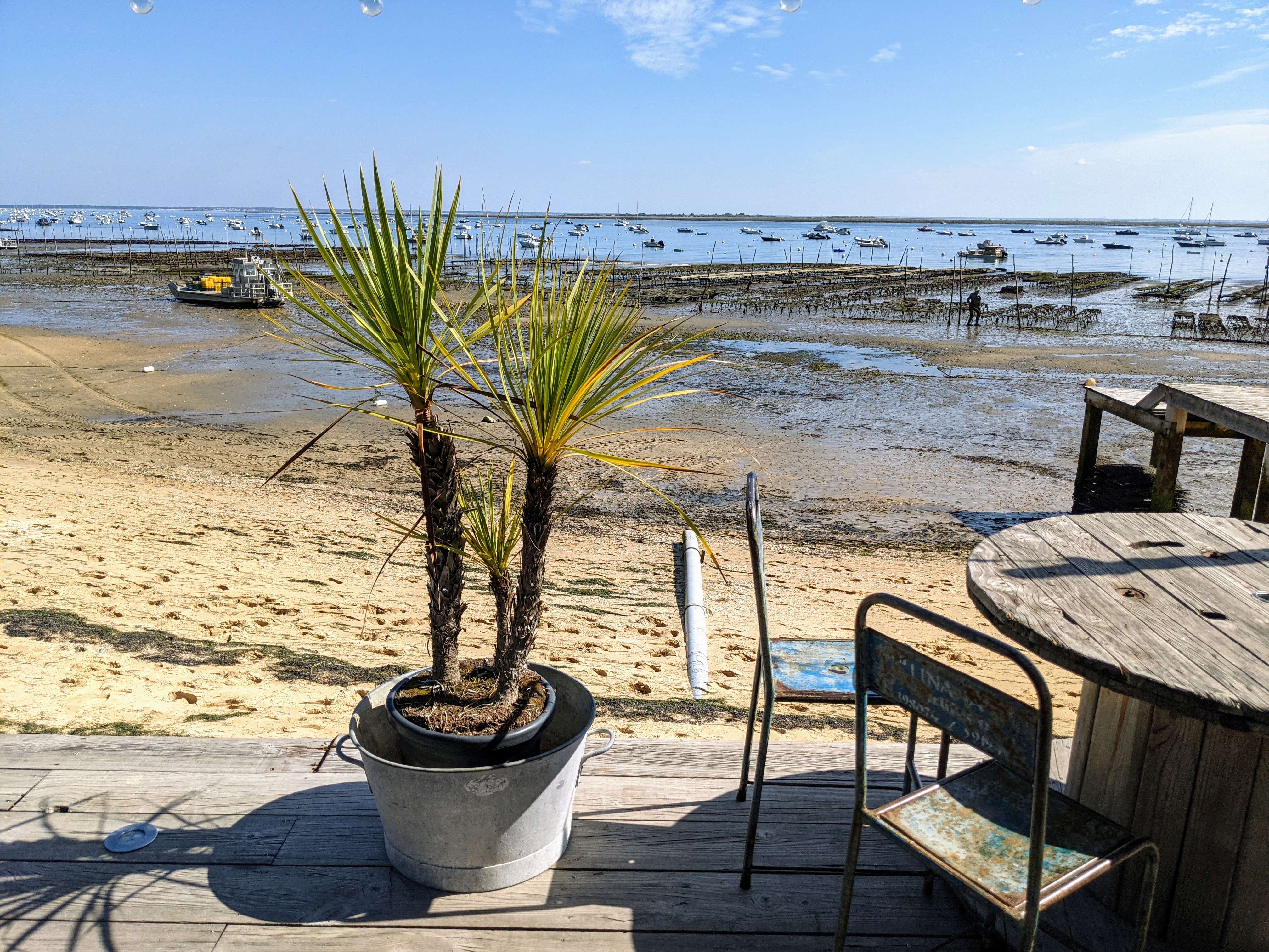 Petit moment de détente avec un point de vue magnifique sur le bassin et les parcs à huîtres. Un peu cher mais accueil super et très bons produits.