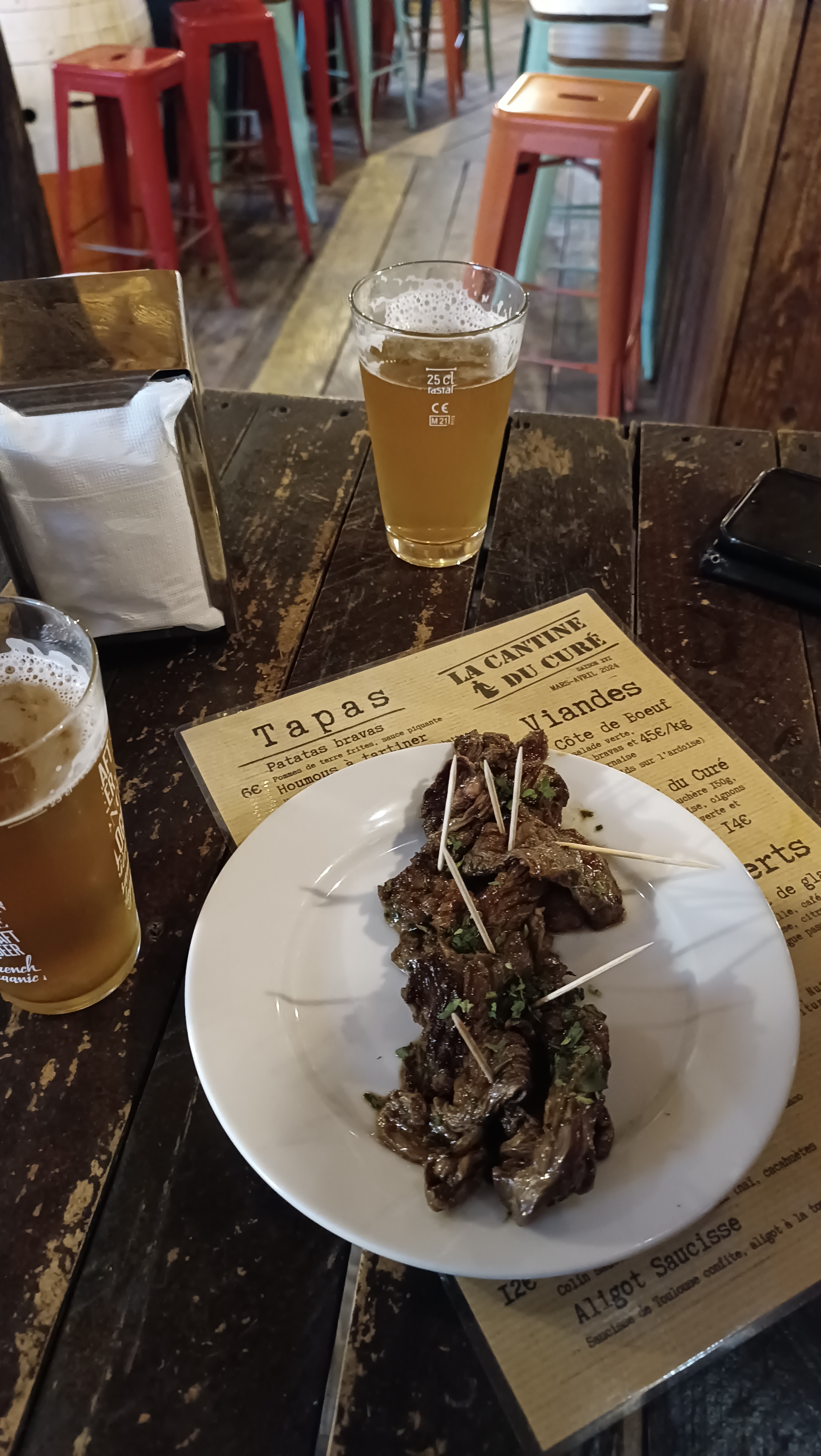 Adapte depuis plusieurs années, le cadre est super !! En couple, famille, copains, petites ou grandes tablées, soirée concert... tout le monde trouve son compte, et faire une parenthèse (ressemblant aux vacances) à n'importe quel moment, à proximité de chez soi c'est vraiment top ^_^ J'insiste vraiment sur ce point malgré les (La) réflexions qui vont suivre. Jusqu'à présent bien servi, rapidement et à tarif correct, On a ressenti 2 bémols cette année : 1: Avec l'augmentation des prix (même si tout le monde y est passé), mais plus que les patatas bravas à 6€ (toujours bien servies), le reste est passé à 8€ maintenant. Mais surtout et surtout !!! 2 : GROS bémol pour LE tapas (Assortiment de petites entrées variées, à l'espagnole) de base : le pan con tomate et jambon(préparations typiques de la Catalogne : Il s'agit de tranches de pain souvent légèrement grillées, frottées , par une moitié de tomate, et de l'ail + assaisonnées avec de l'huile d'olive et du sel, accompagné de jambon serrano ou ibérique selon le menu et tarifs) qui était la valeur sûr et superbement réalisé jusqu'à présent à la Cantine du curé. Qu'est il devenu ??!!!???? : Du pain avec un filet d'huile posé dessus et de l'ail à se frotter soit même, avec un petit récipient de tomate ?... La réponse à cette interrogation posé à une serveuse est que les clients ont eu fait des remarques par rapport à l'ail dessus le pain (trop apparemment). Je comprend que commercialement ont s'adapte à la majorité des demandes MAIS !!!! si je vais dans un lieu où la spécialité est le tapas, je m'adapte à la recette traditionnelle et non l'inverse !! Le croustillant du pain marié au gout de la tomate, de l'ail et de la qualité du serrano faisait du lieu LA raison du pourquoi aller en Espagne? alors qu'à coté de chez nous on a ça ^_^ En ayant déjà discuté avec plusieurs autres Carcassonnais de souche qui pensent pareil, et en espérant que d'autres habitués fassent basculer la balance du Commercial >> au plaisir de l'endroit incontournable ^_^